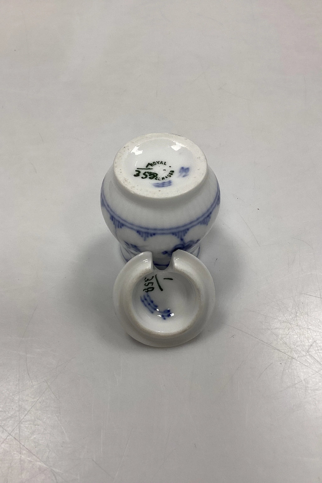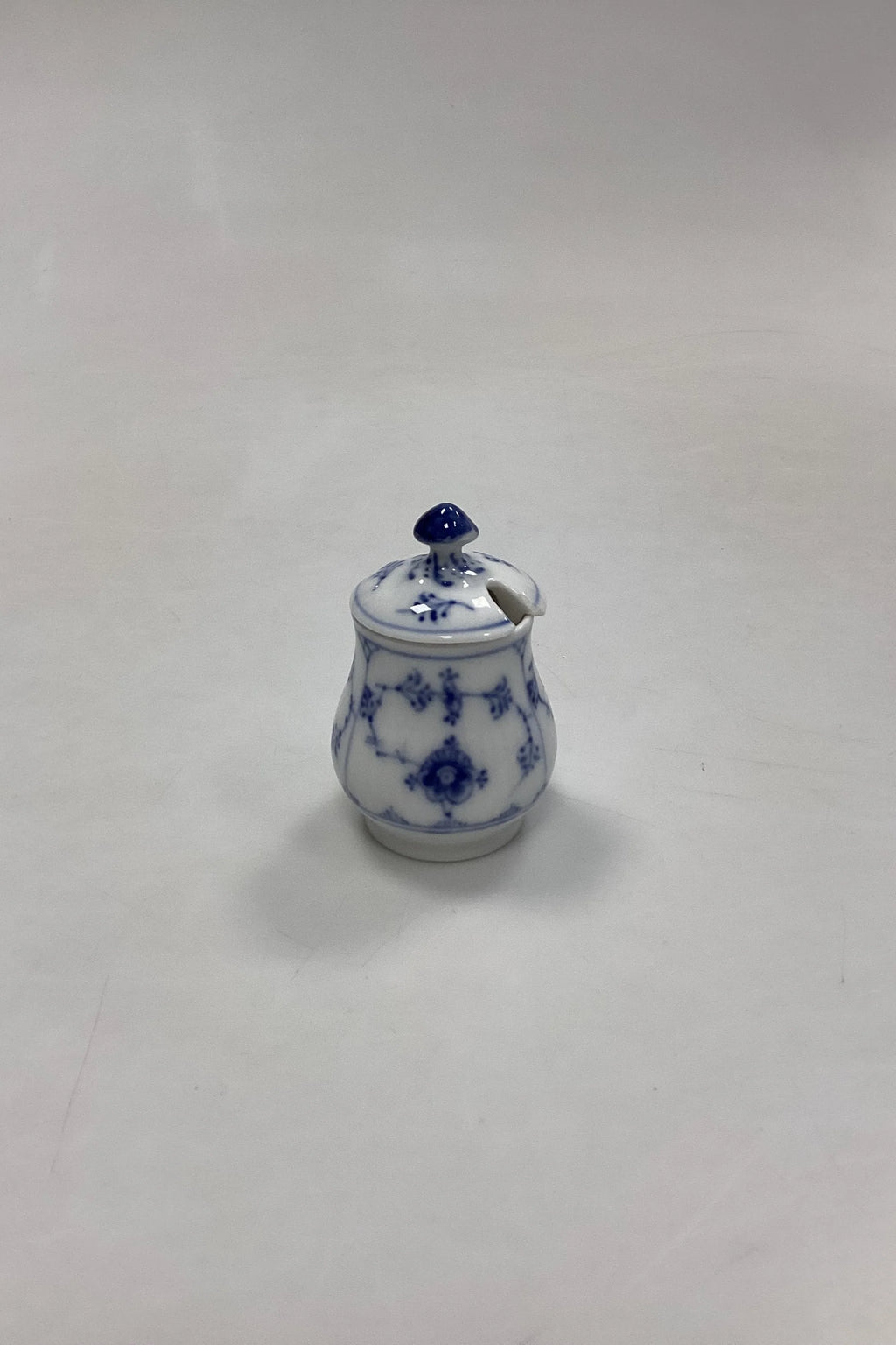 Royal Copenhagen Musselmalet Riflet Lille Sennepskrukke No. 358. Måler 7 cm / 2,75 in. Lille afslag på låget, se foto.