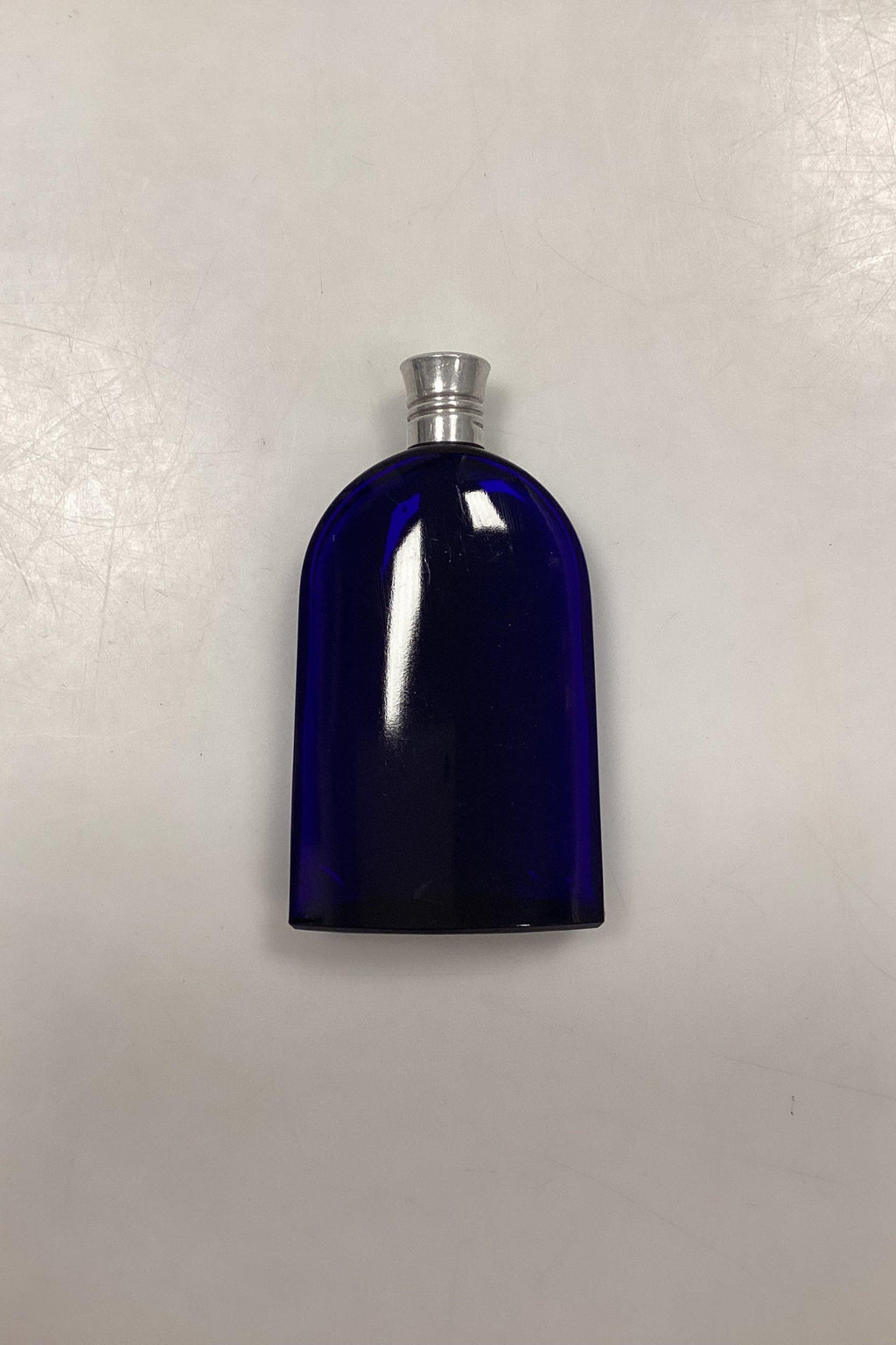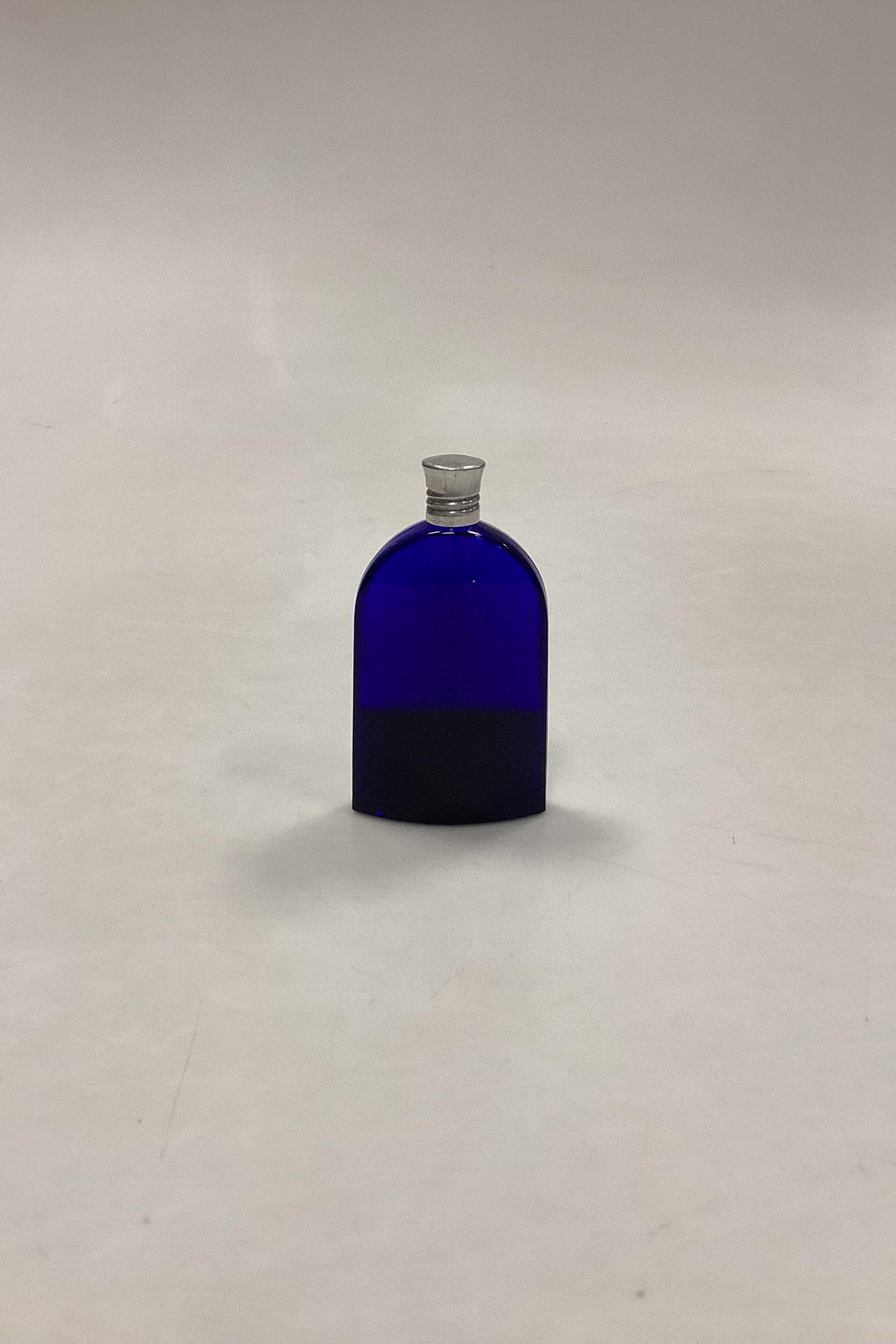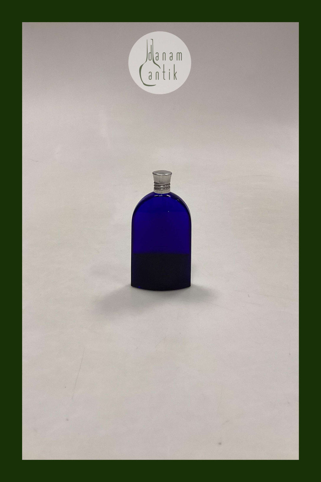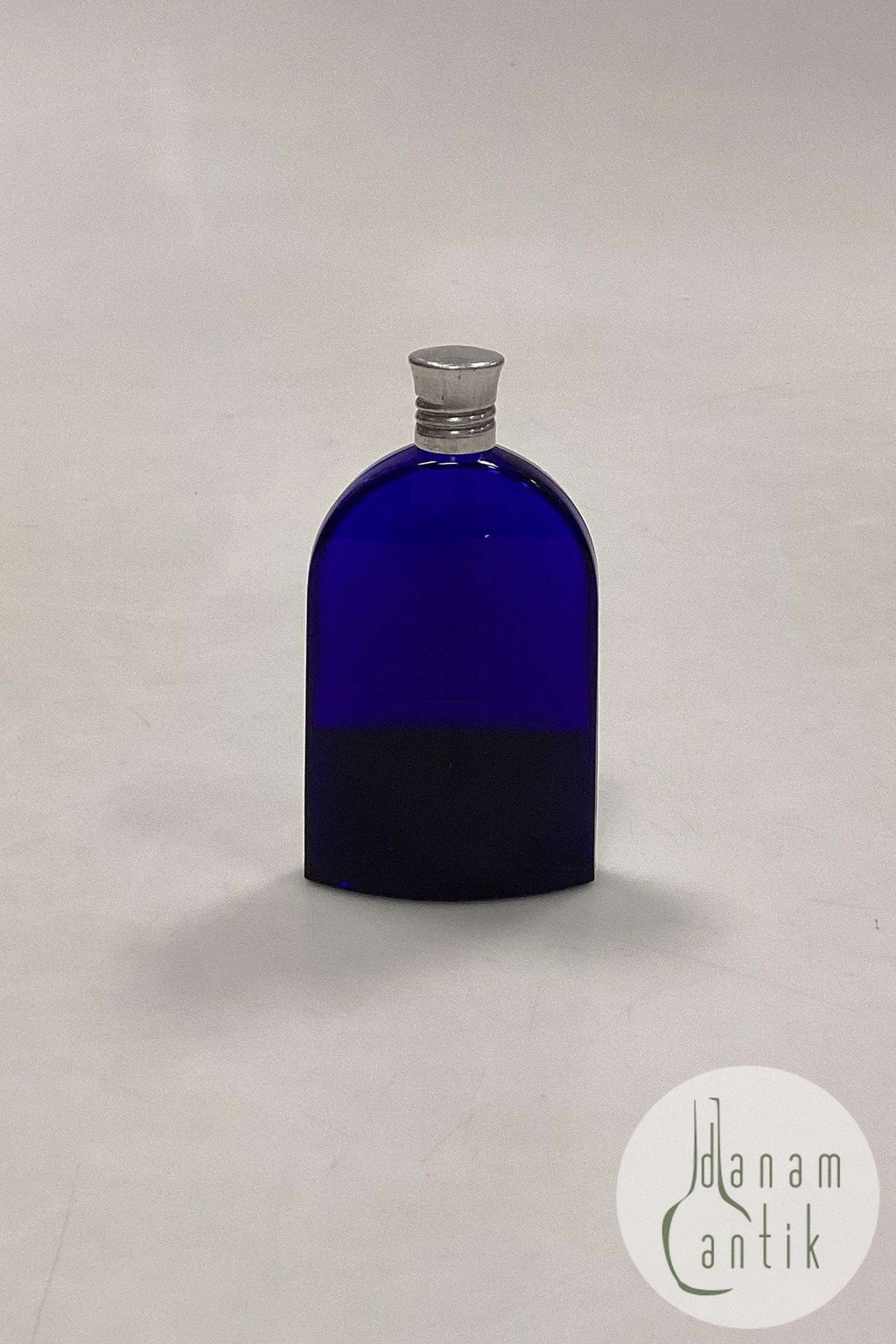Medicinflaske i koboltblå glas med aluminiumslåg. Måler 9 cm x 4,9 cm x 2 cm. / 3.55 in. x 1.93 in. x 0.79 in.