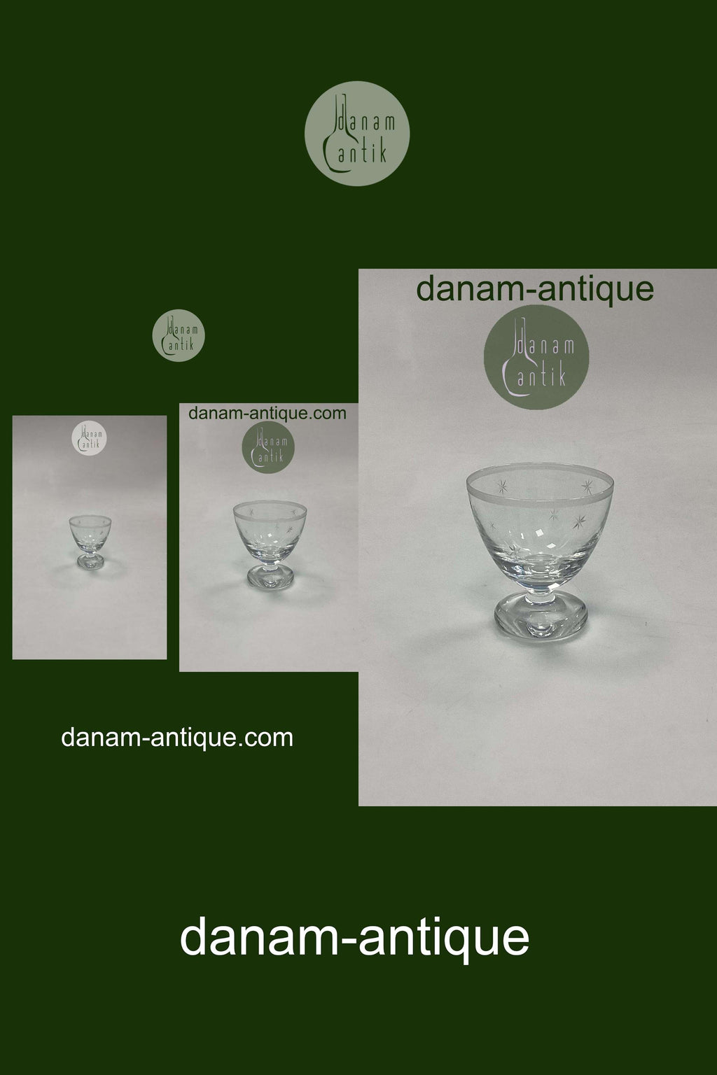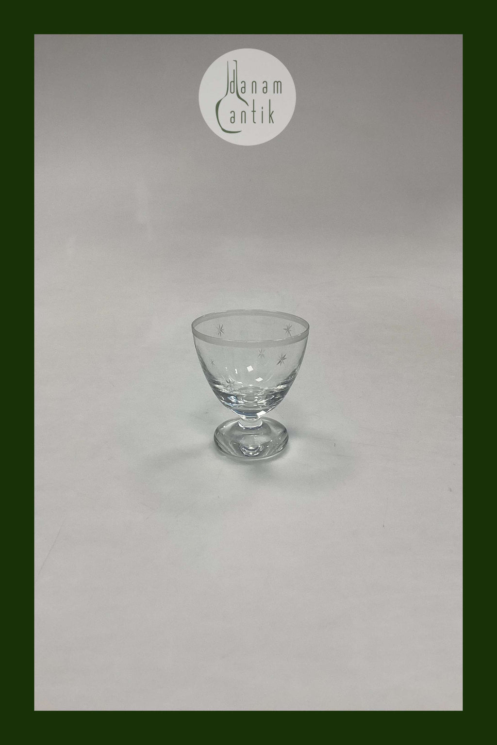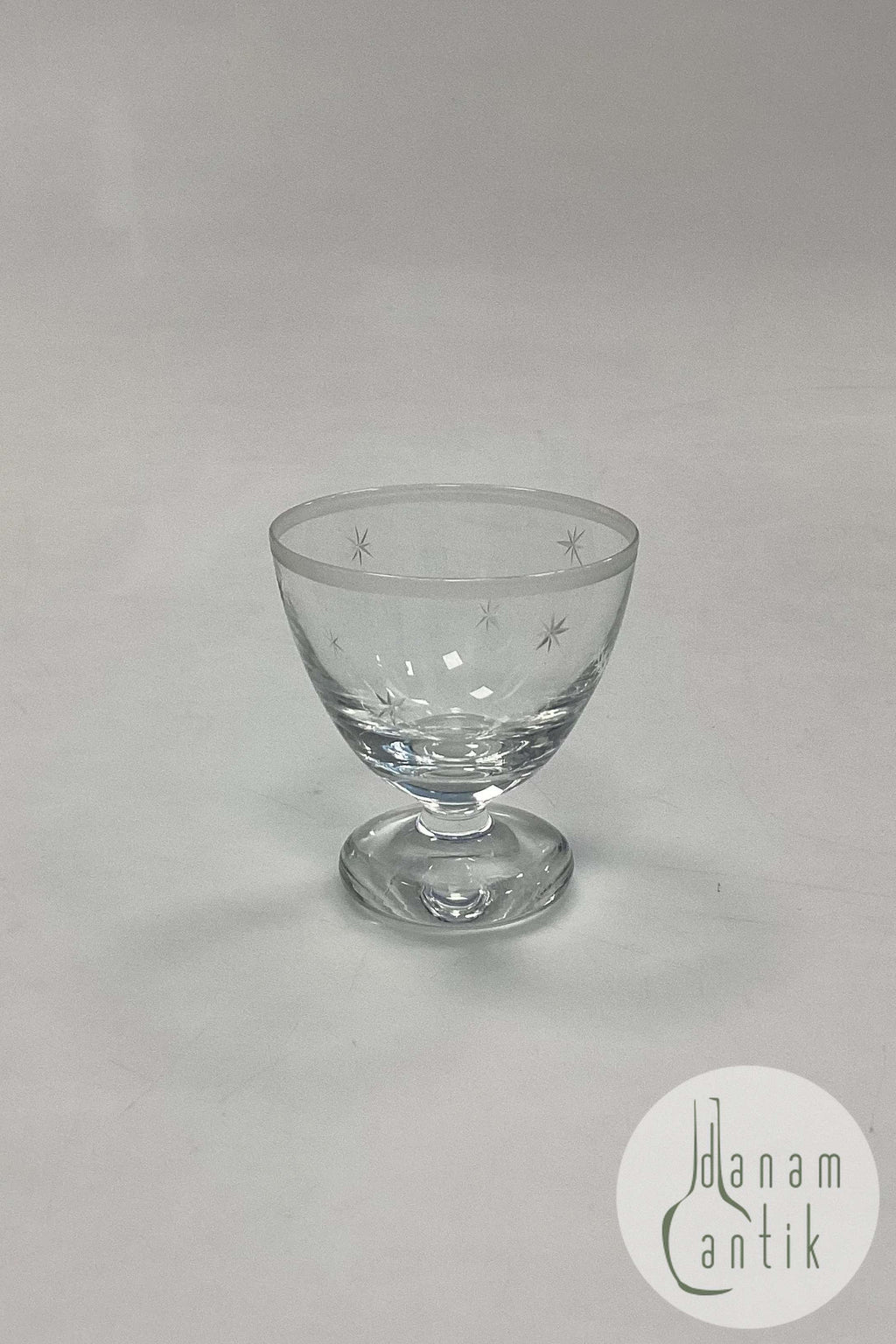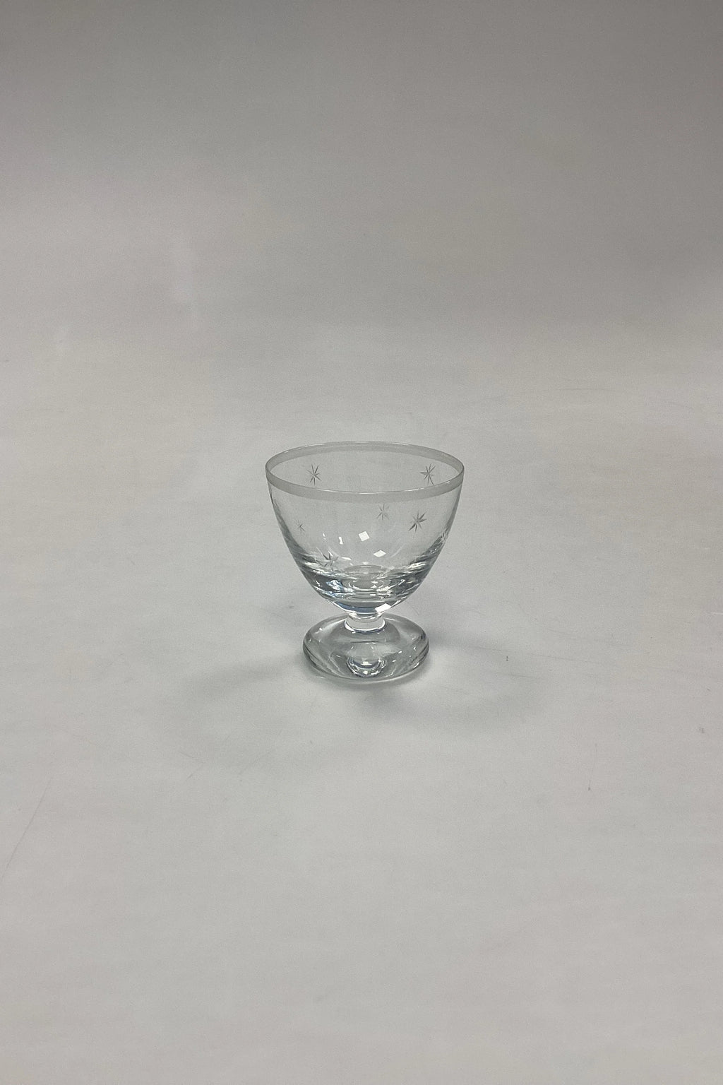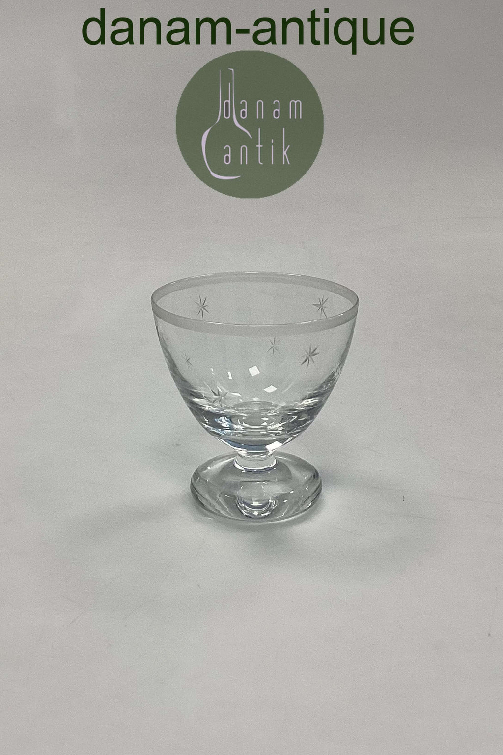 Holmegaard Mars Hedvinsglas med slebne stjerner og matteret rand. Designet af Per Lütken 1943. Udgået i 1960. Måler 6 cm / 2,36 in.