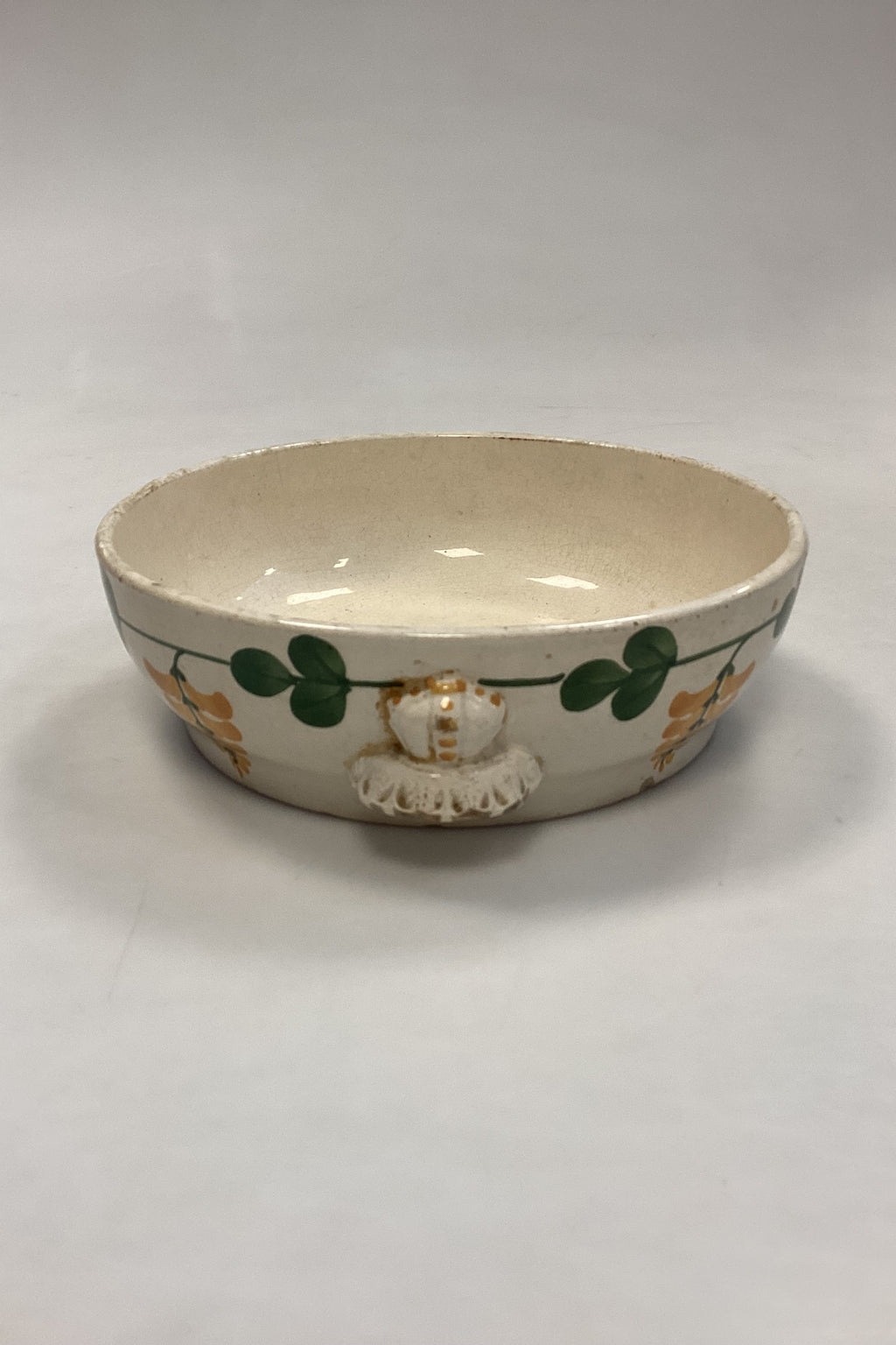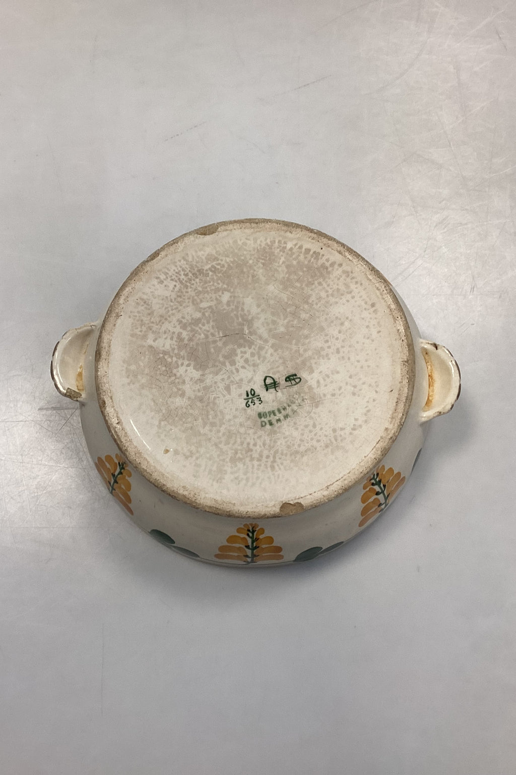 Aluminia Guldregn (Laburnum) Terrin uden låg No. 10/653. Krakeleringer, hårrevner og små afslag.Måler 19,5 cm x 6 cm / 7,67 in. x 2,36 in.Designet af Harald Slott-Møller 1902