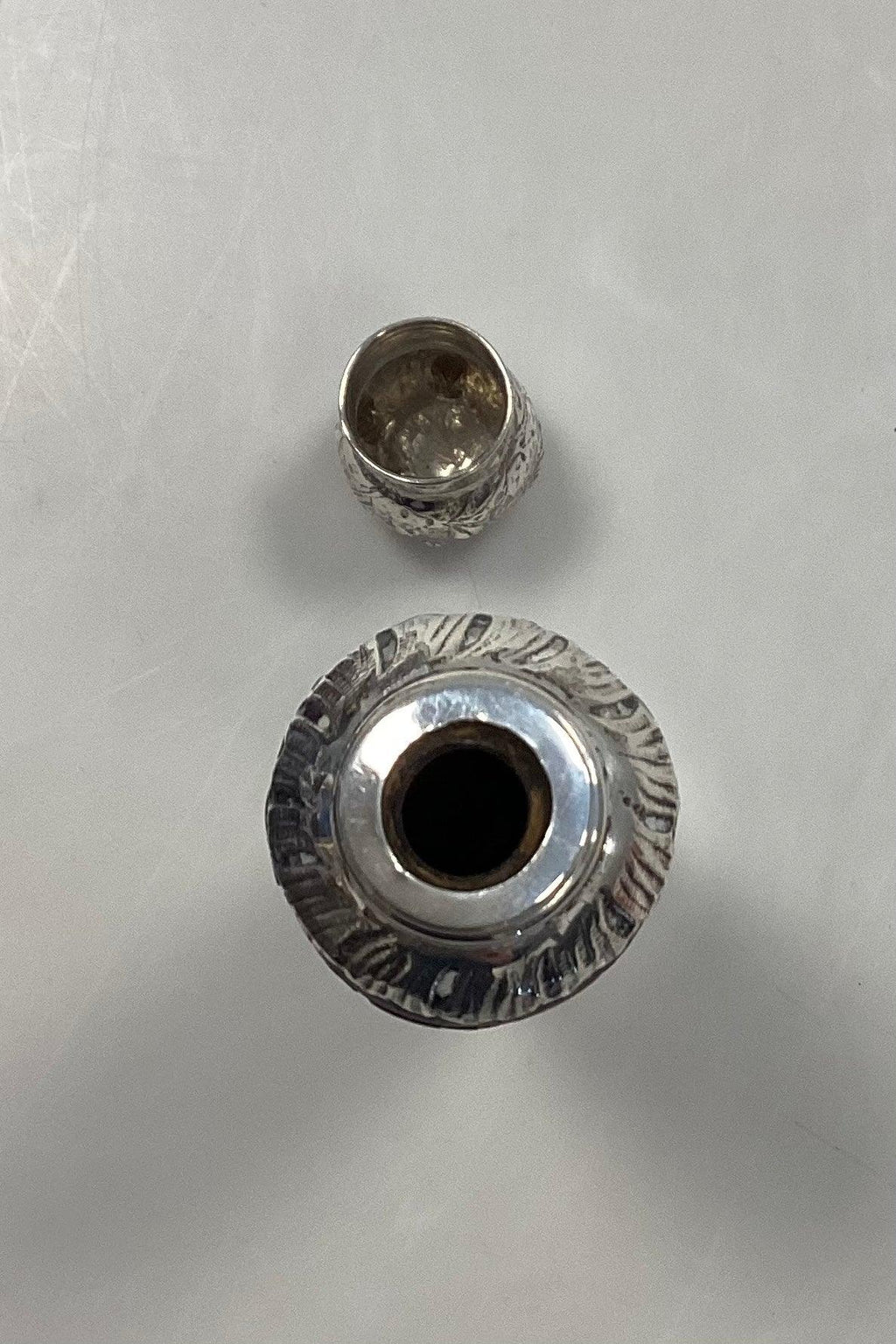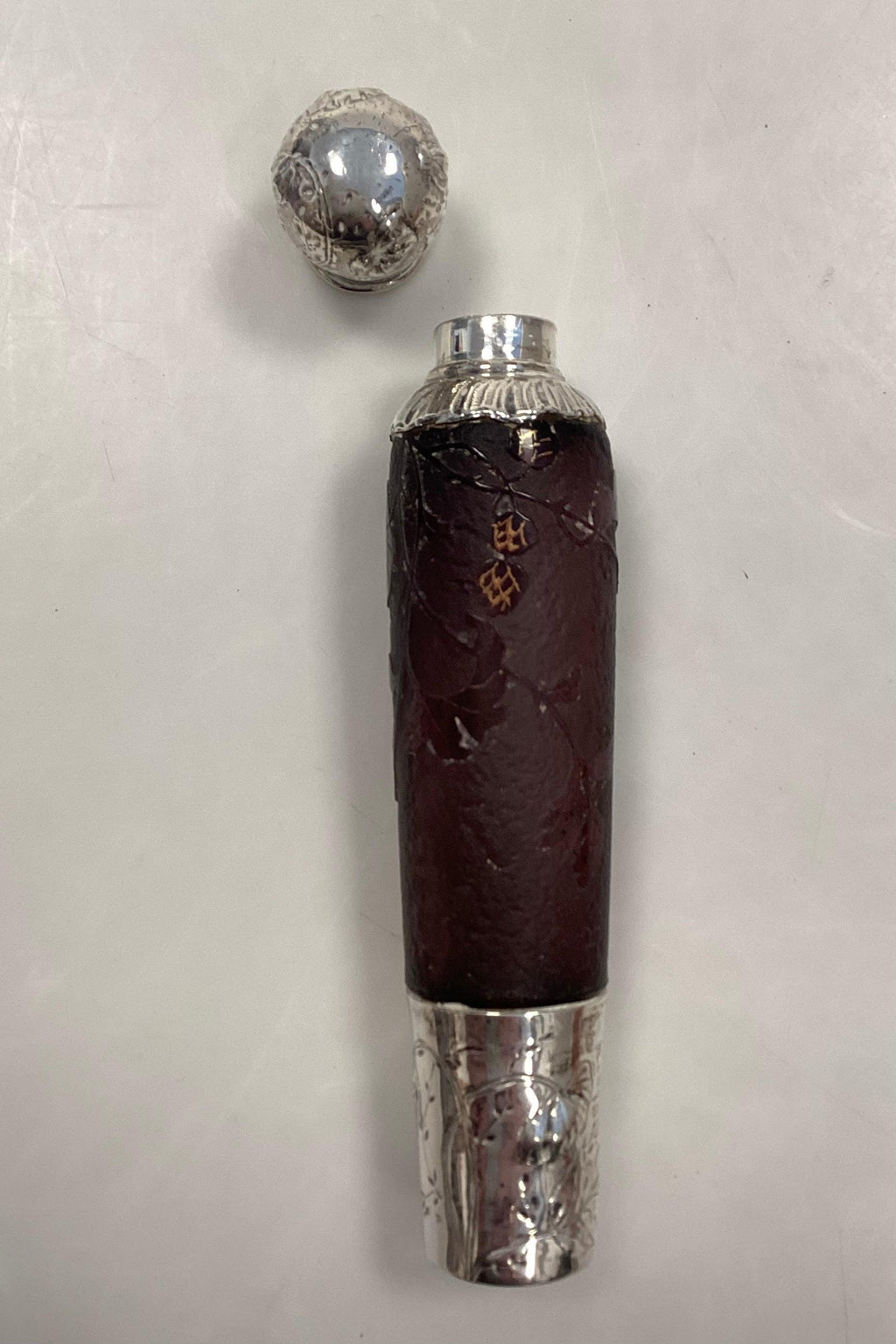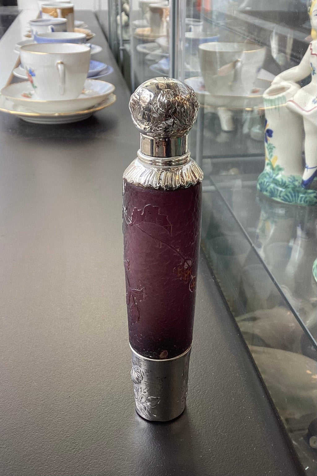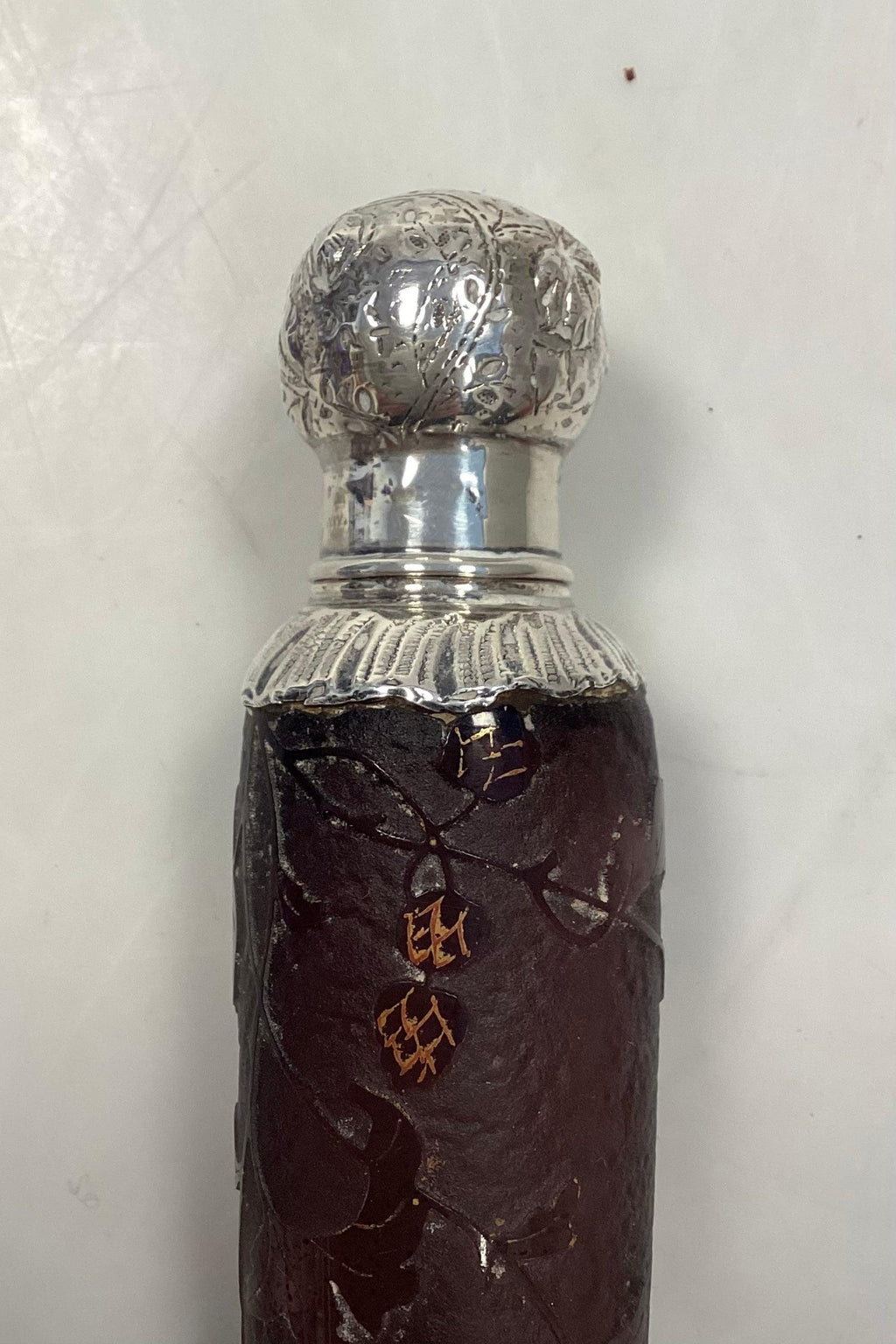 フランス アンティーク アールヌーボー ボトル ボルドーガラス製 花の装飾と葉の浮き彫り 19世紀末期上下ともシルバーマウント、シルバースタンプ付き。良好な状態です。ダメージはない。高さ15cm(5.91インチ)