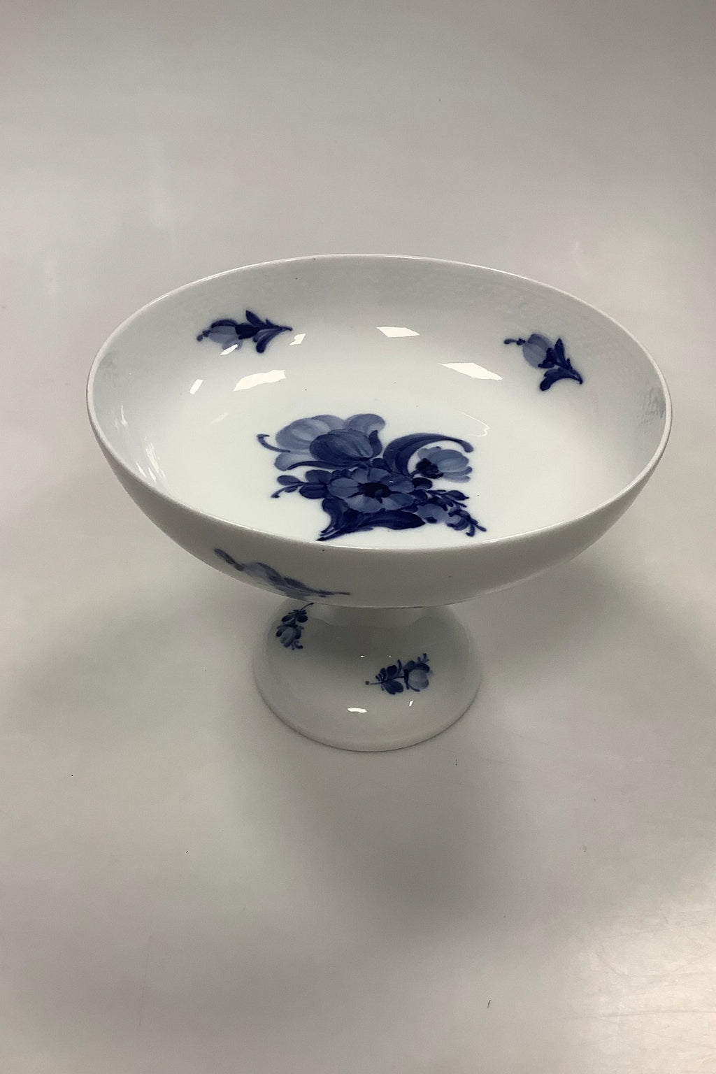 Royal Copenhagen Blå Blomst Flettet Skål på fod No 8064. Måler 21cm og er i god stand. Ældre model, se den nederste del af skålen