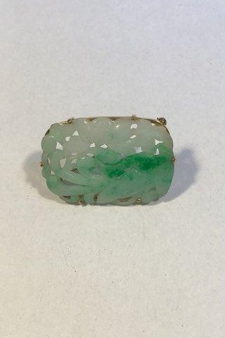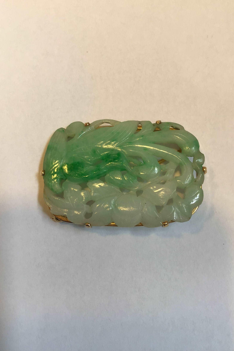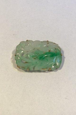 A. Dragsted 18 K Guld Broche med Jade (Fugl og løv) Måler 4.1 cm x 2.8 cm Vægt 10.7 gr
