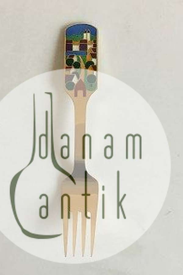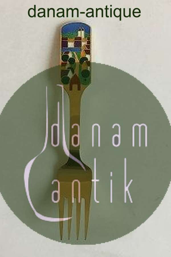 "Byen" kalder Knud Erik Færgemann årets motiv. Han var naivistisk i sin udtryksform og formår at få plads til en hel by med kirke, vandløb og grønne træer på skaftet.