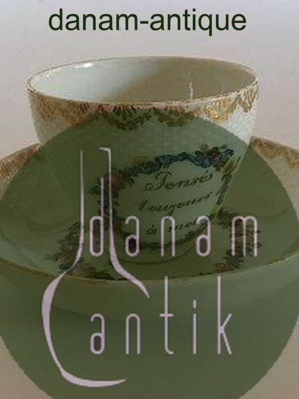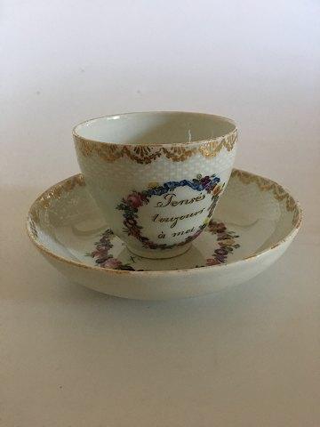 Antik Royal Copenhagen kop og underkop med indskription fra 1790-1810. Med fransk indskription: Tænk altid på mig