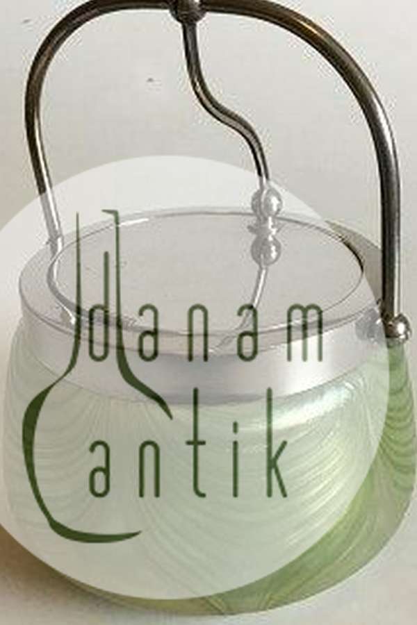 Art Nouveau Sukkerskål/Bonbonniere i lysegrønt iriserende glas med forsølvet låg. Antageligt fra Loetz glasfabrik i Bøhmen. Fra beg. af 1900-tallet. I fin stand.