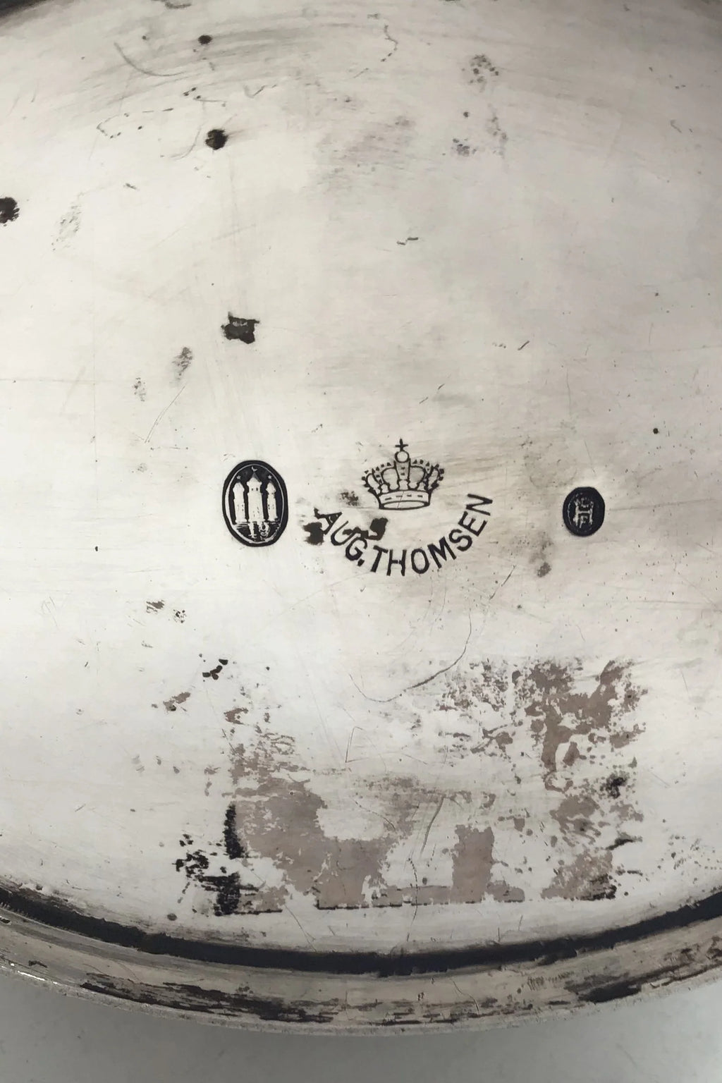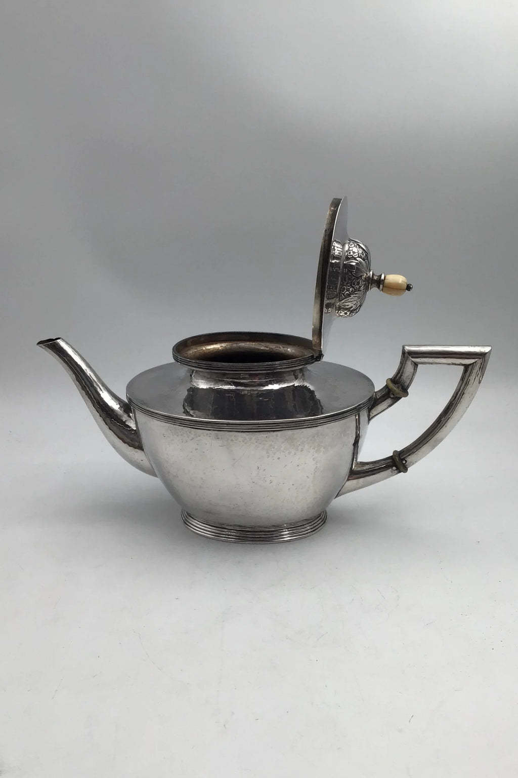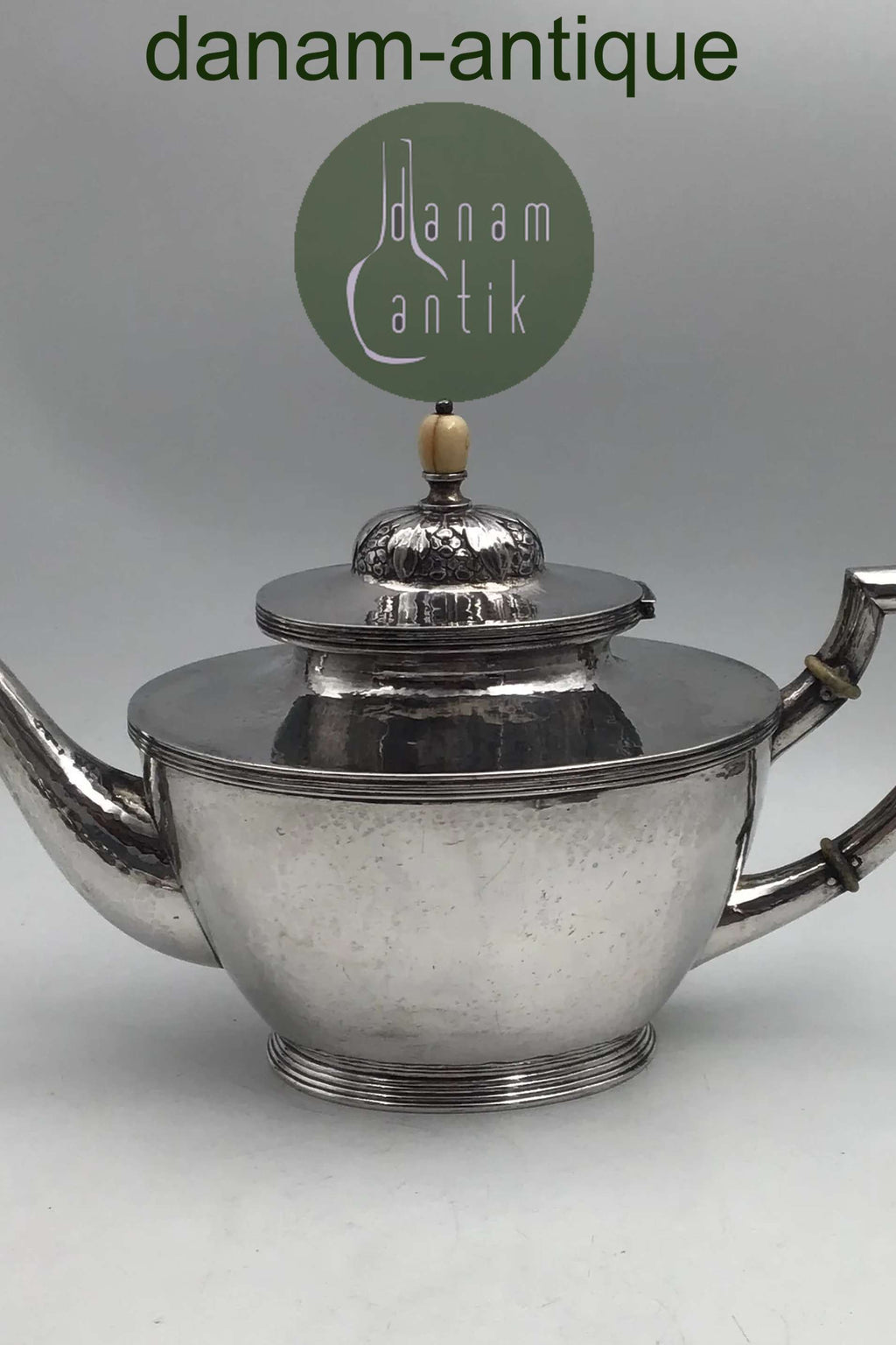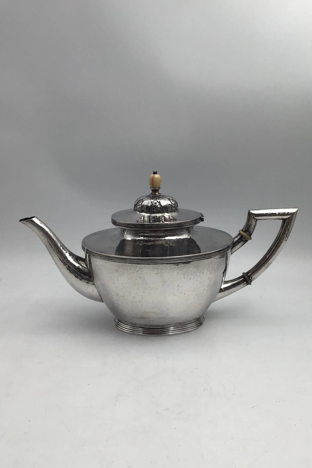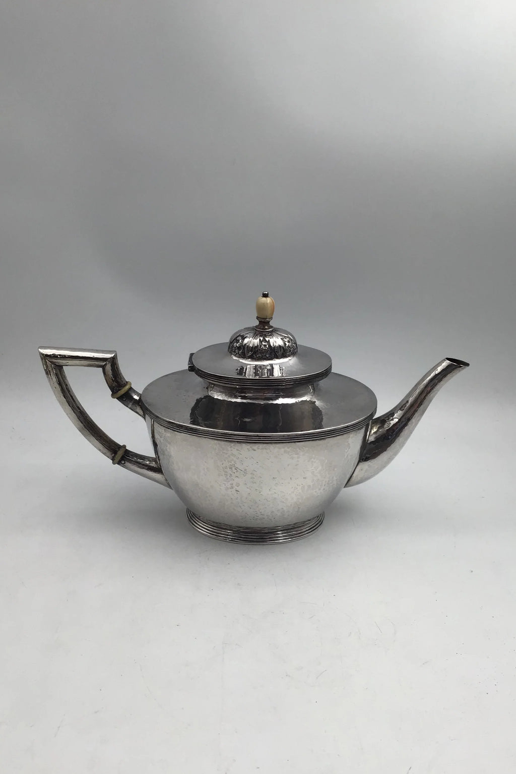 August Thomsen Sølv Thekande (1919) Måler H 16 cm (6.29 inch) L 29 cm (11.41 inch) B 12.5 cm (4.92 inch) Vægt 591.6 gr (20.87 oz)