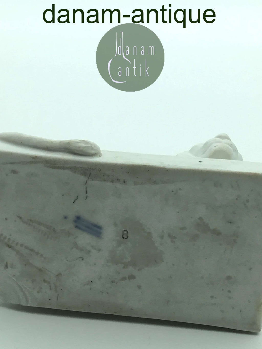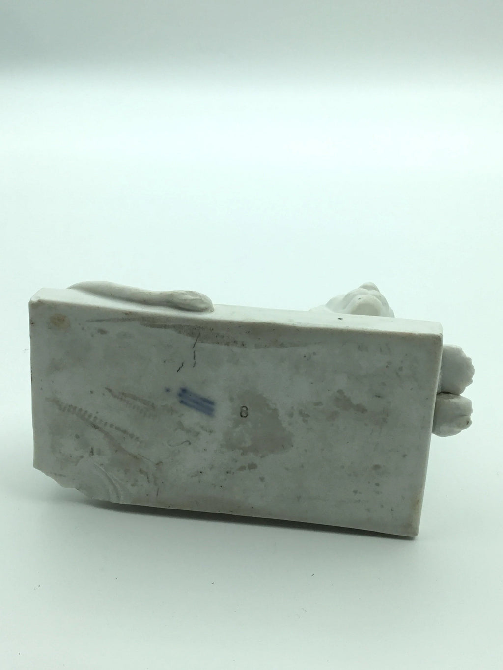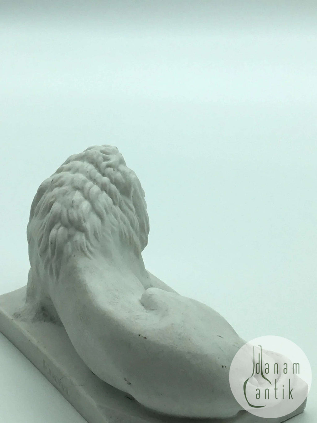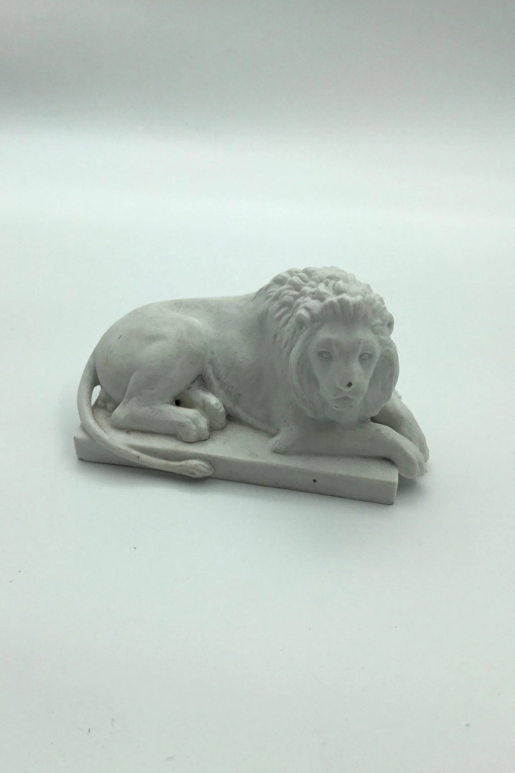 Bertel Thorvaldsen: Figur af Liggende Løve i bisquit. Fremstår med to større skår på hjørnerne bag løven. Måler 8cm høj (3.14 inch) og 13,5cm lang (5.31 inch).