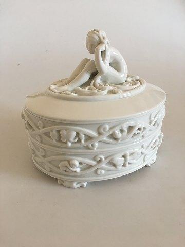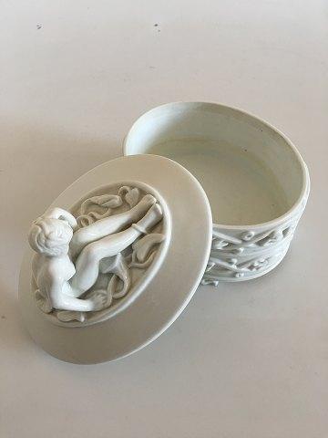 Bing & Grøndahl Art Nouveua Bonbonniere med dame, græshoppe, fisk, bille, snegl og firben Sigfried og Olga Wagner?. Måler 17cm x 16cm og er i perfekt stand.