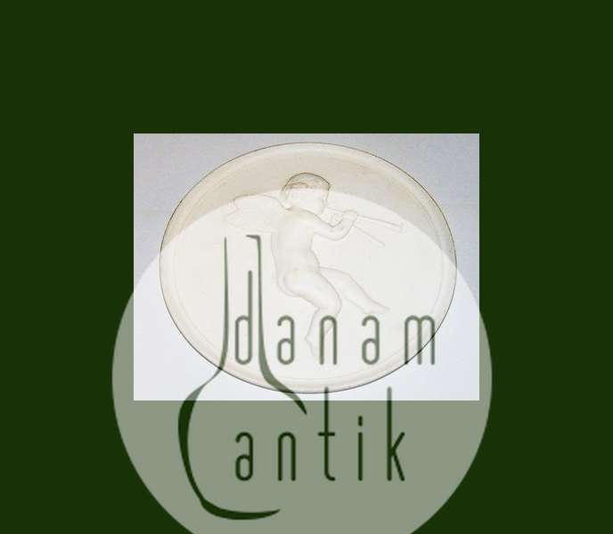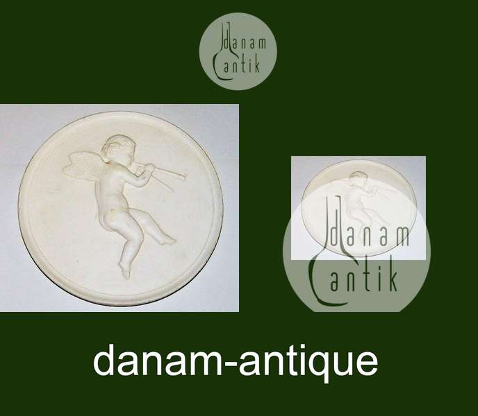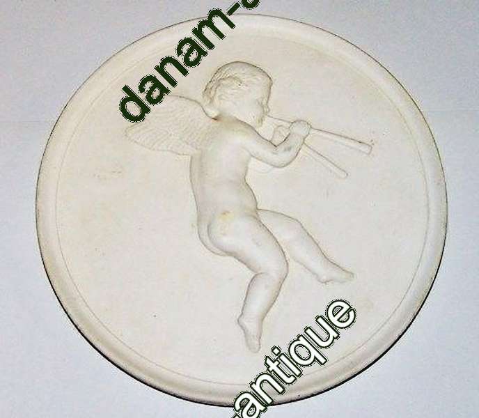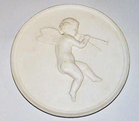 Bing & Grøndahl Biscuit Platte Biscuit Musikkens Genius No 102. Kopi fra 1862 efter Thorvaldsens original fra Rom 1838, udført af Pietro Galli. Måler 14,5cm