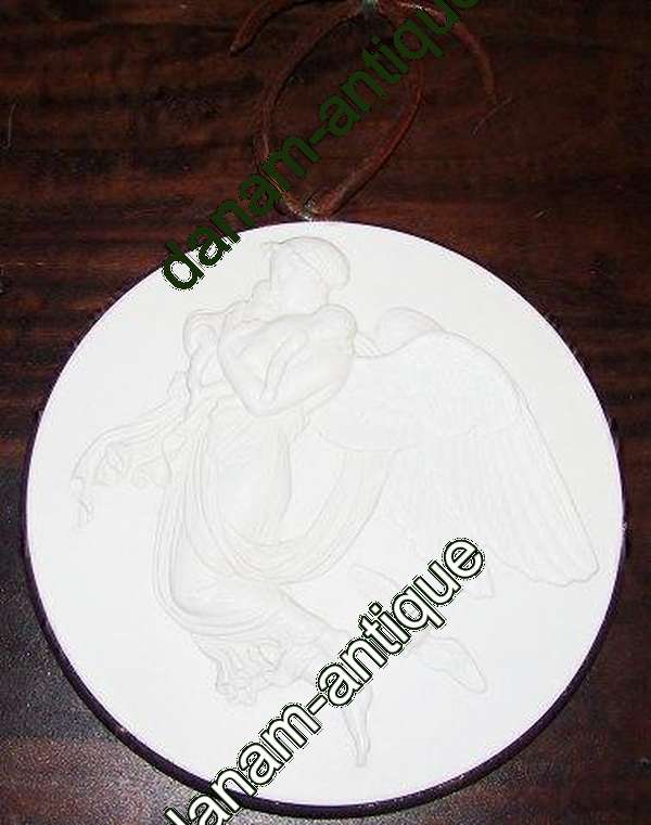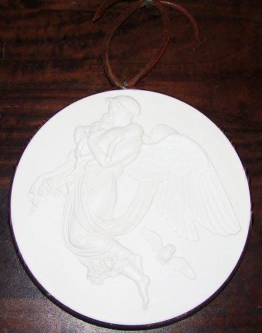 Bing og Grøndahl Biscuit Platte Nat No 123. Kopi fra 1840 after Thorvaldsens original fra Rom 1815. Måler 20,5cm (8.46 inch). Gravstedsplatte. Monteret med lædersnor