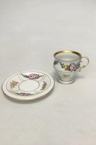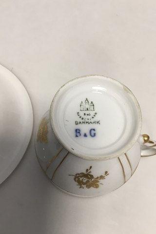 Bing & Grøndahl kop og underkop i guld og polykrom overglasur med blomstermotiv. Underneden mærket med blåt B & G stempel. H: 8,5 cm