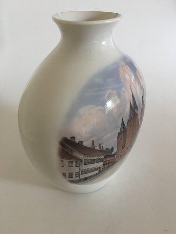 Bing og Grøndahl Unika Vase No. 507 af Sophus Jensen. Motiv: Vor Frue Kirke i Kalundborg. Måler 30 cm x 25 cm / 11,81 in. x 9,84 in. I fin hel stand.