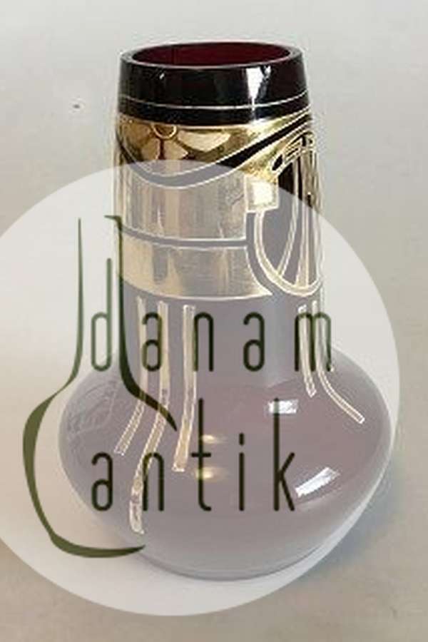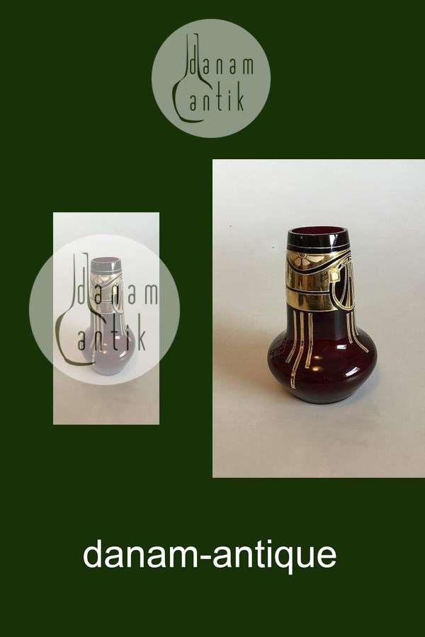 Bordeauxrød vase med gulddekoration. No 324/150. Måler 13,5 cm