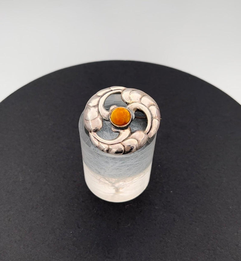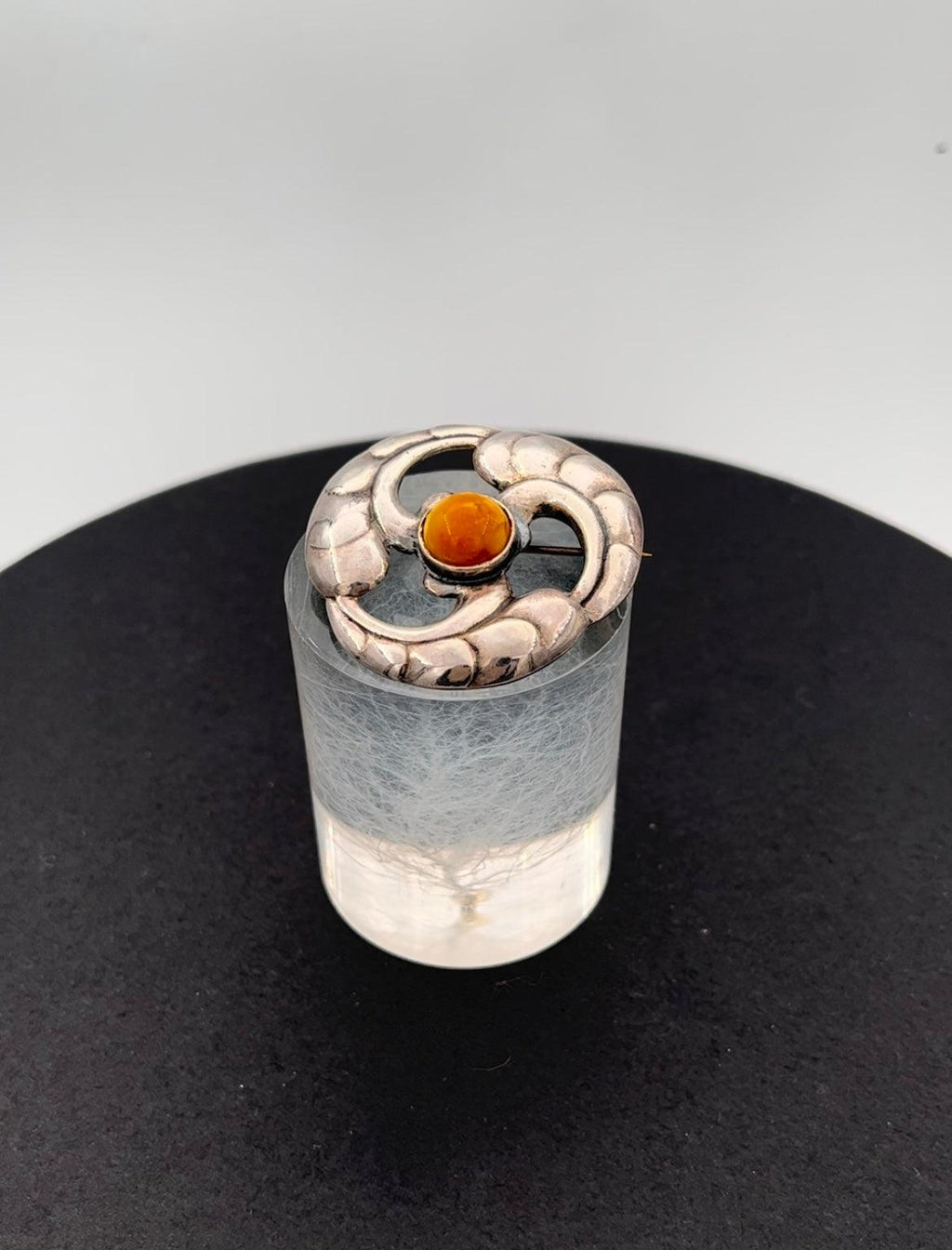 Broche sterling sølv med rav center i blad-ornamentik, 12,4 gr. Stemplet PE for Peter Ernst, Skagen