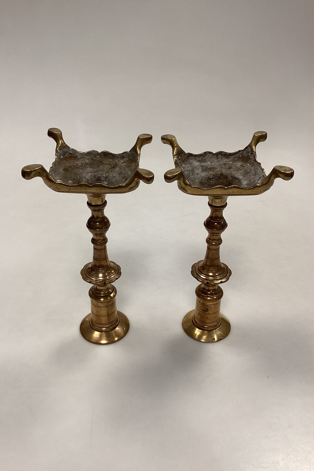 Antikke høje Lysestager i Messing, et par. Lettere slitage, buler og skævheder.
