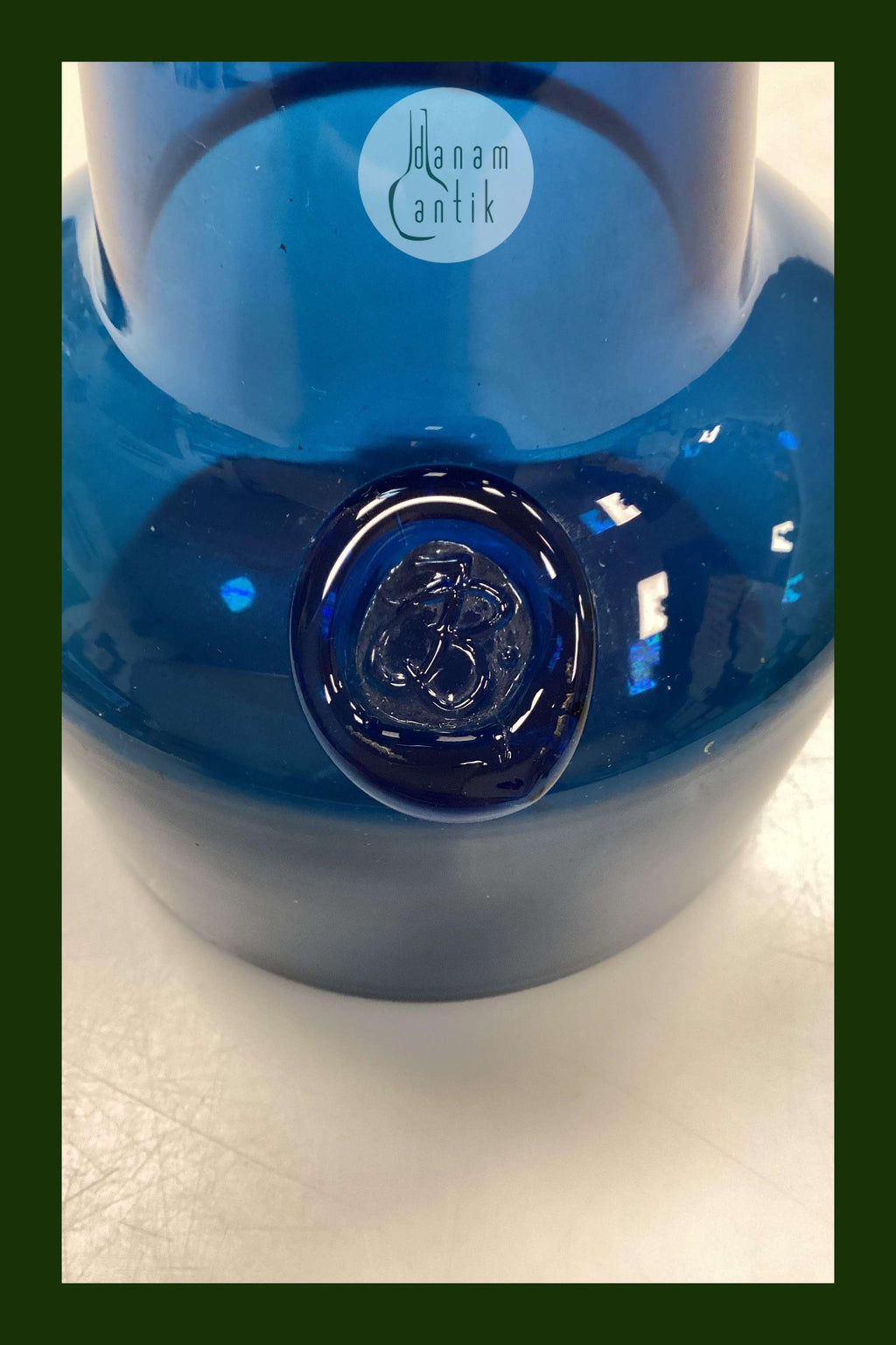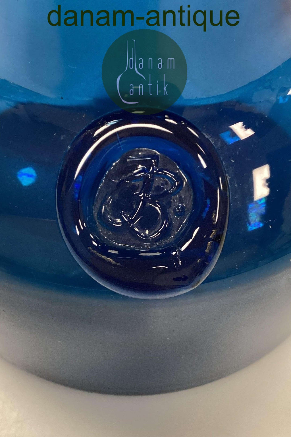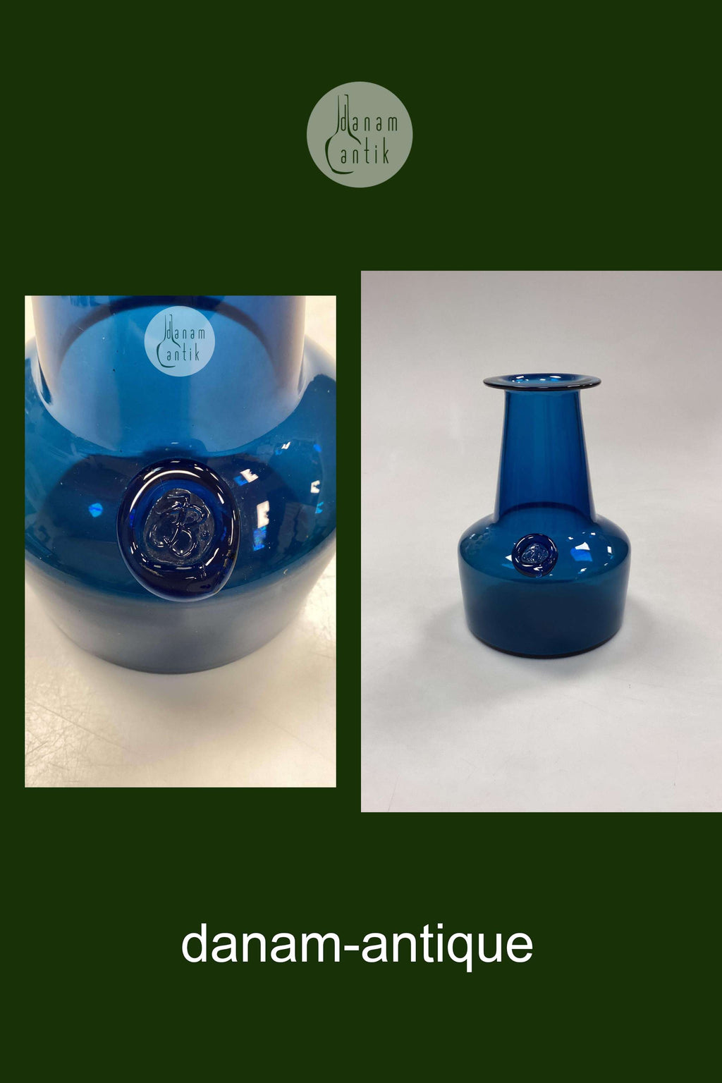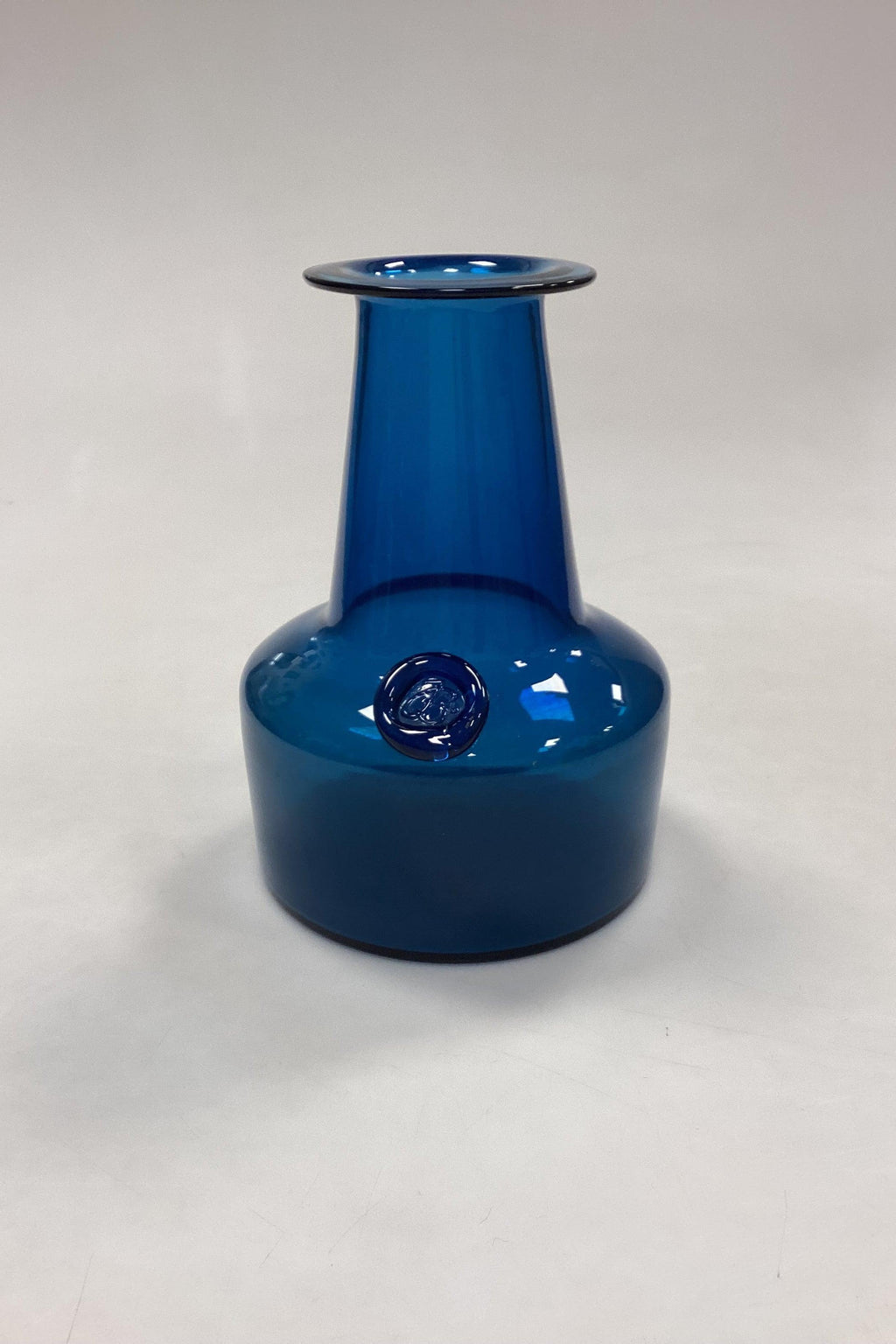 Holmegaard Capri petroleumsblå Glasvase. Designet af Jacob Eiler Bang. Måler 16,3 cm x 11,5 cm / 6.42 in. x 4.53 in.