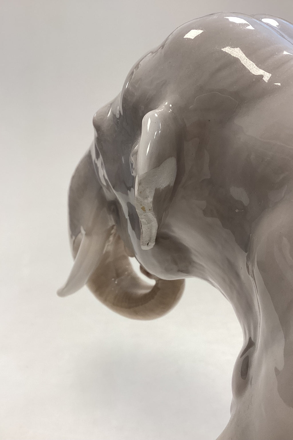 Royal Copenhagen Figur Elefant No. 447. Designet af Theodor Madsen i 1903. Sjælden figur. 1. Sortering. Ikke nummereret. Små afslag på fødder, brændingsrevne under højre forben, og knækket øre, se fotos.