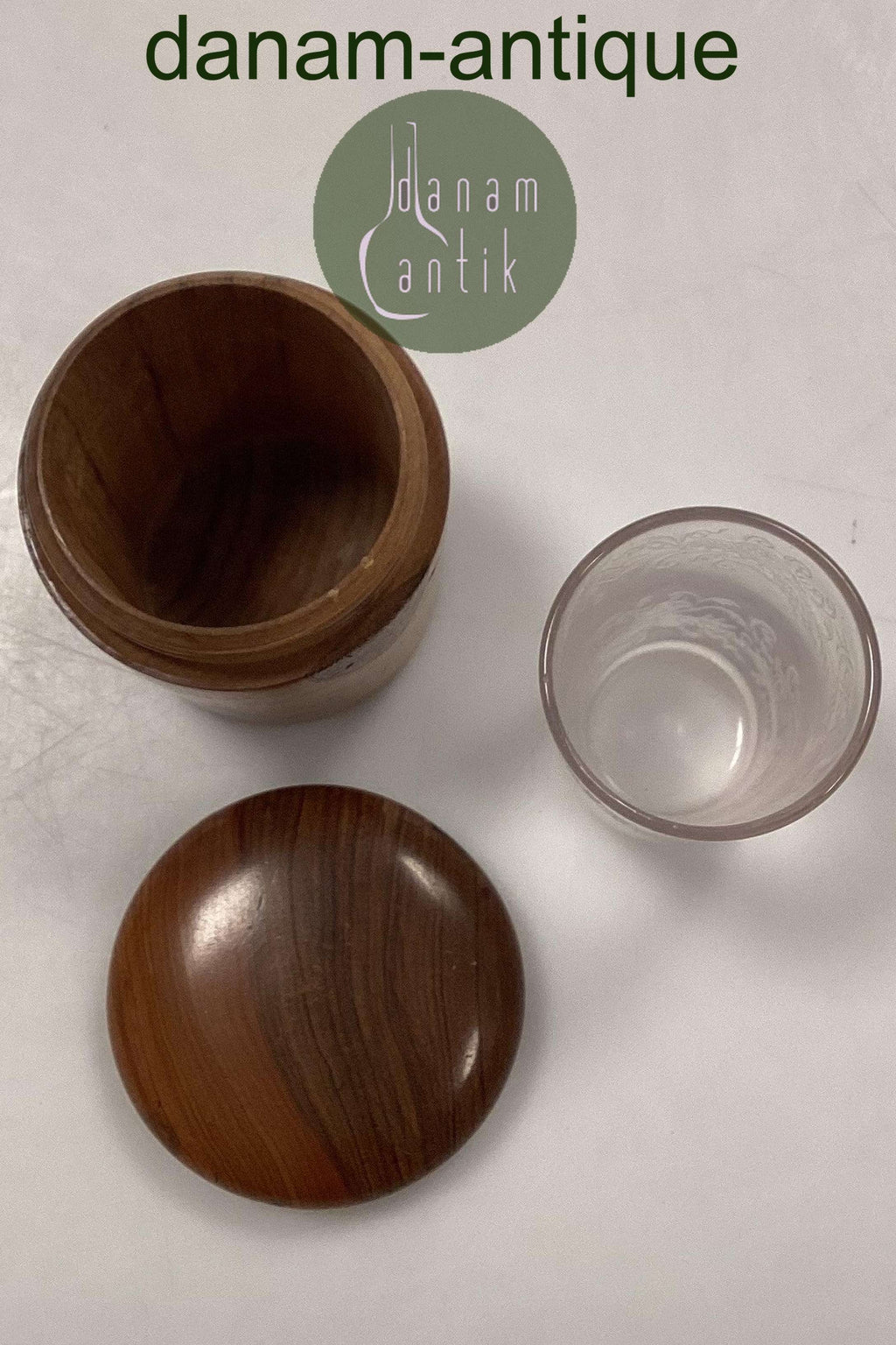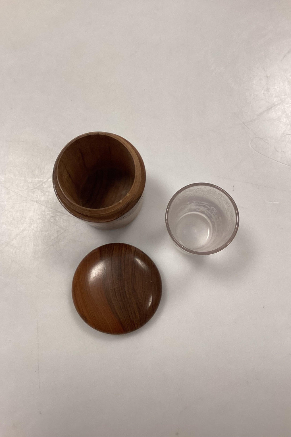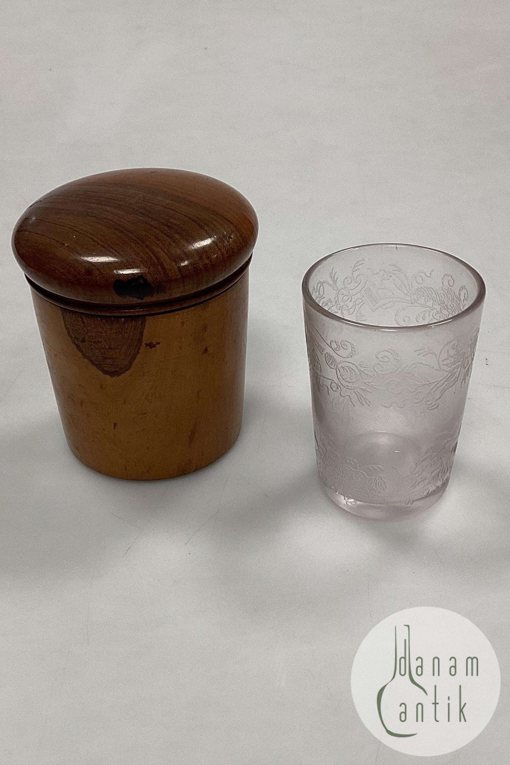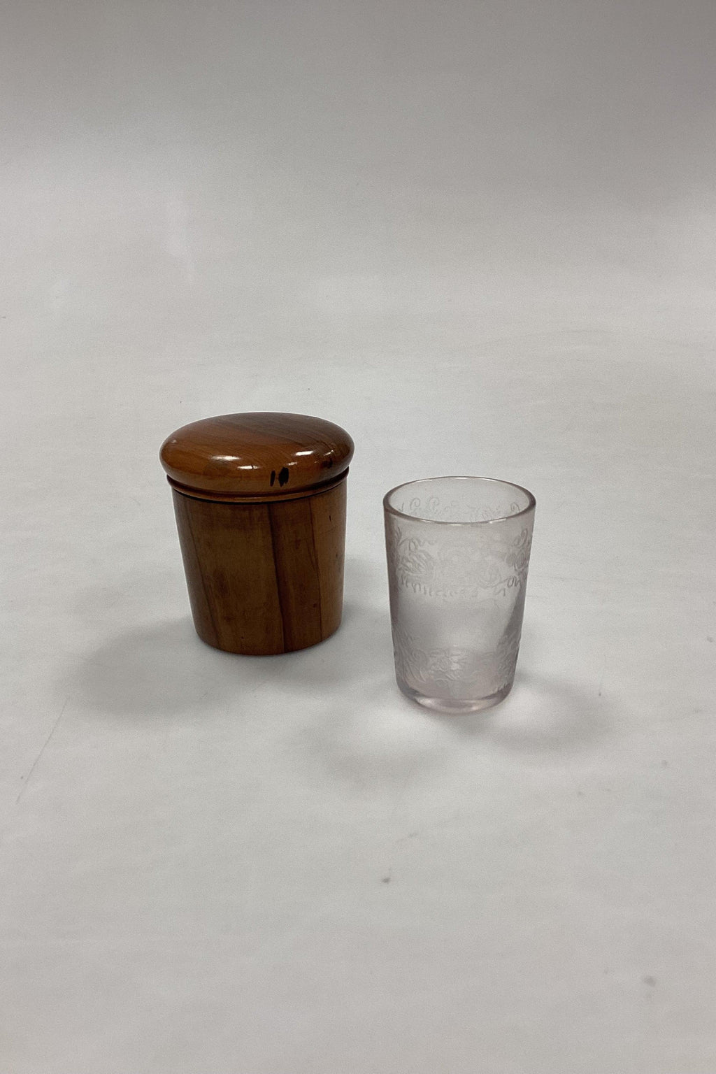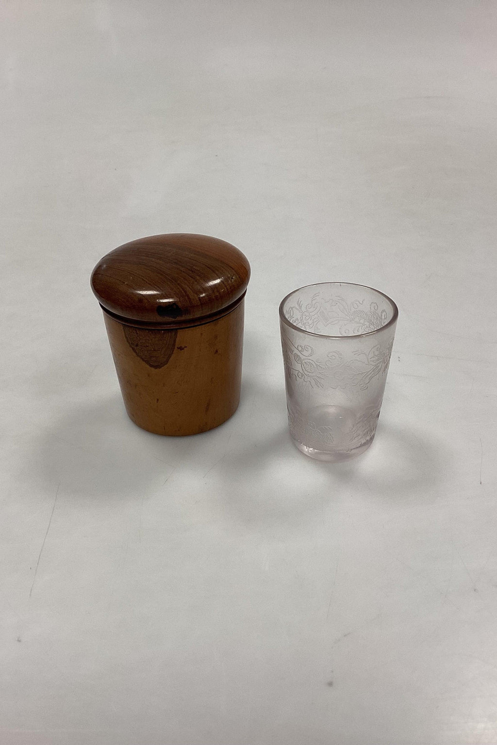 Rejseglas i træetui med skruelåg. Glasset har slibninger med motiver af fabeldyr.