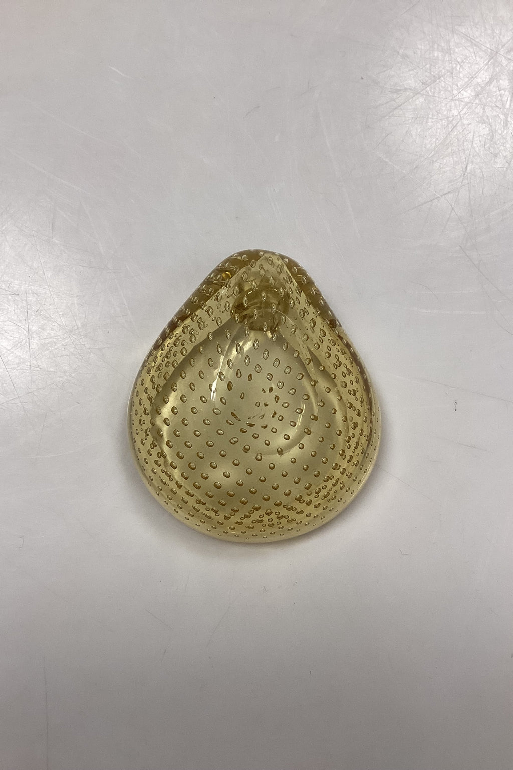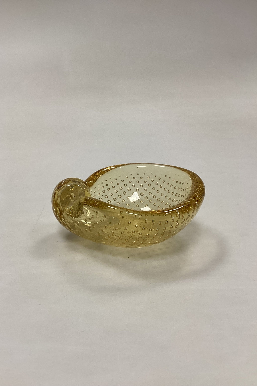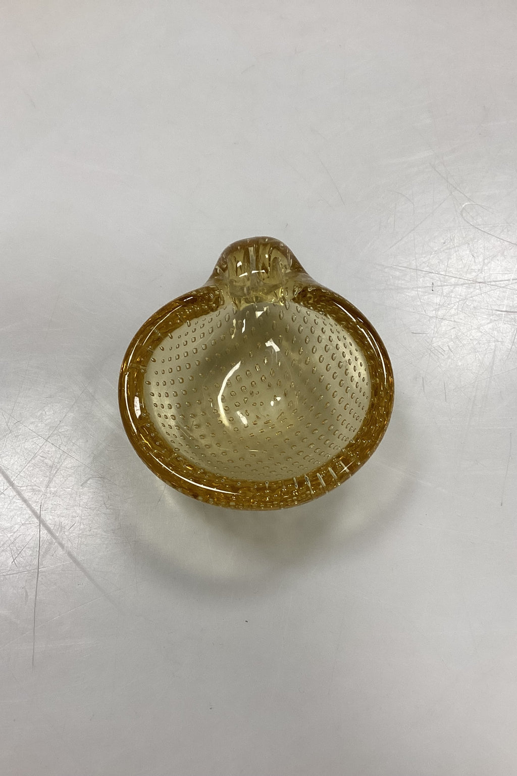 Lille Glasskål med bobler. Sandsynligvis skandinavisk fra 1950´erne. Farve: Ravgul. Lettere brugsspor i bunden, se foto.