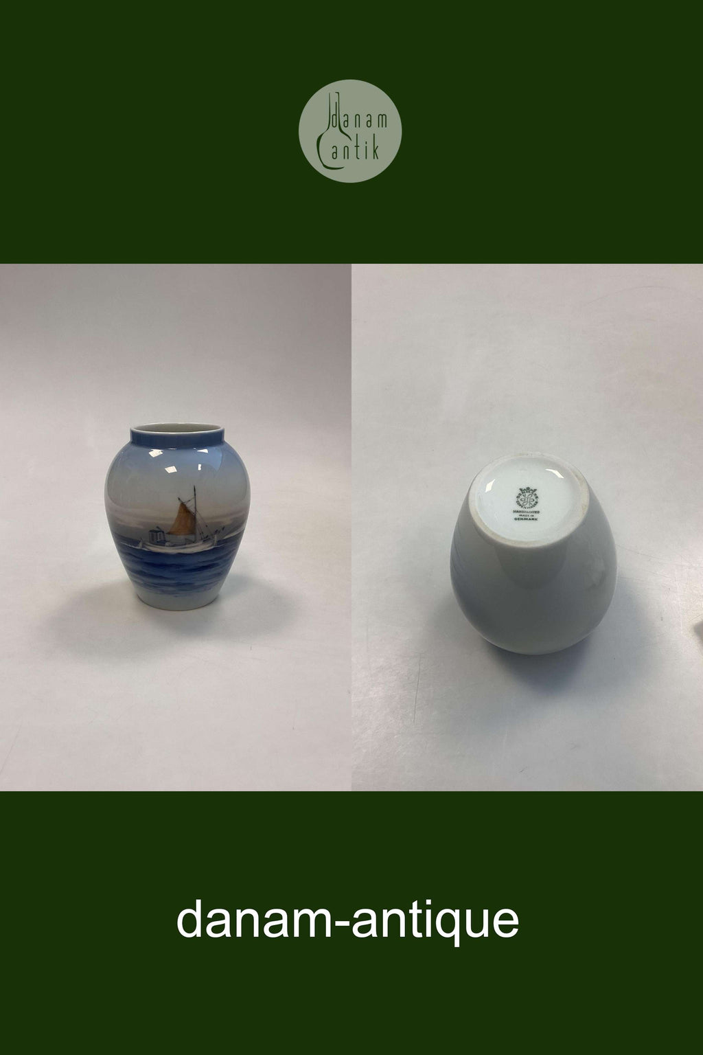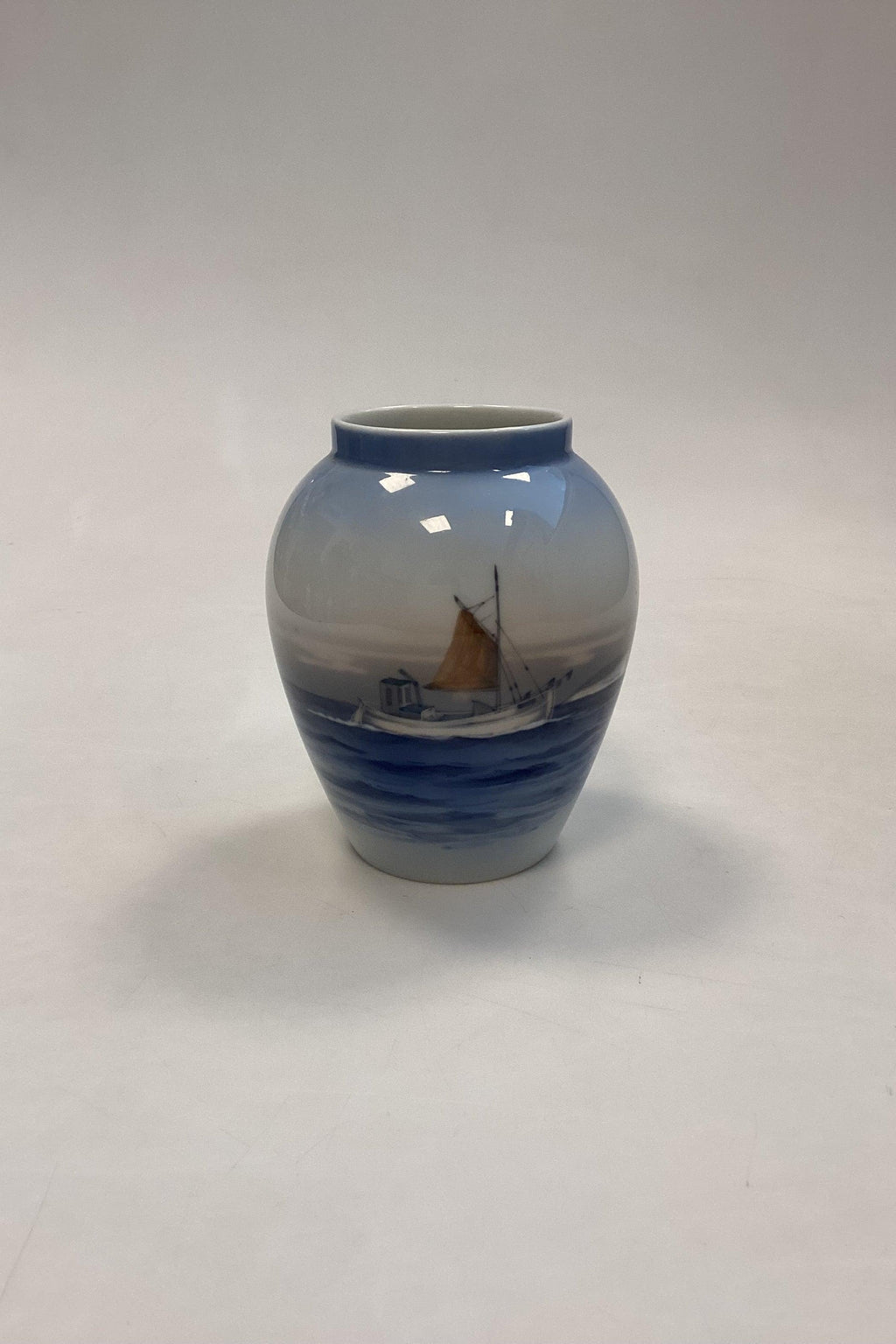 Lyngby Porcelæn Vase med Fiskekutter No. 74-2. Måler 12,5 cm / 4,92 in.