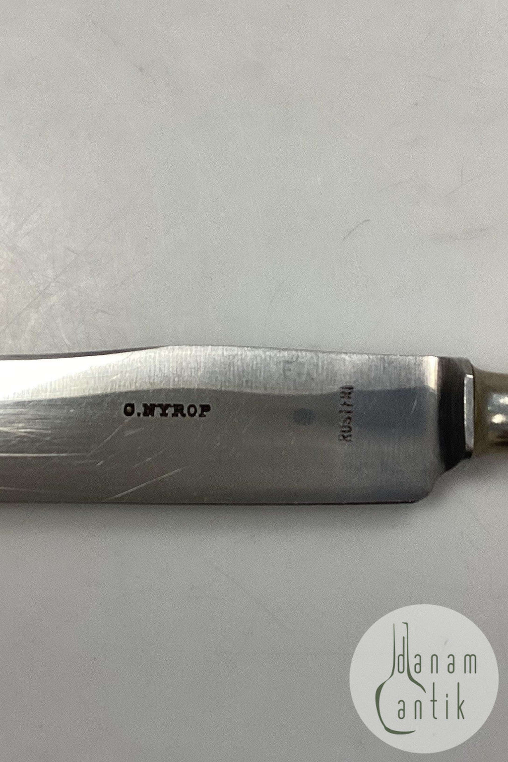 C. Nyrop Stainless Spisekniv med benskaft i lysegult. Sandsynligvis fra begyndelsen af forrige århundrede. I fin stand, men der kan forekomme små revner i skaftet.