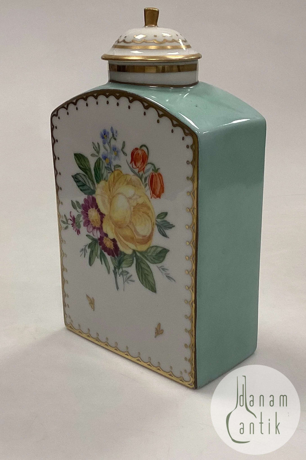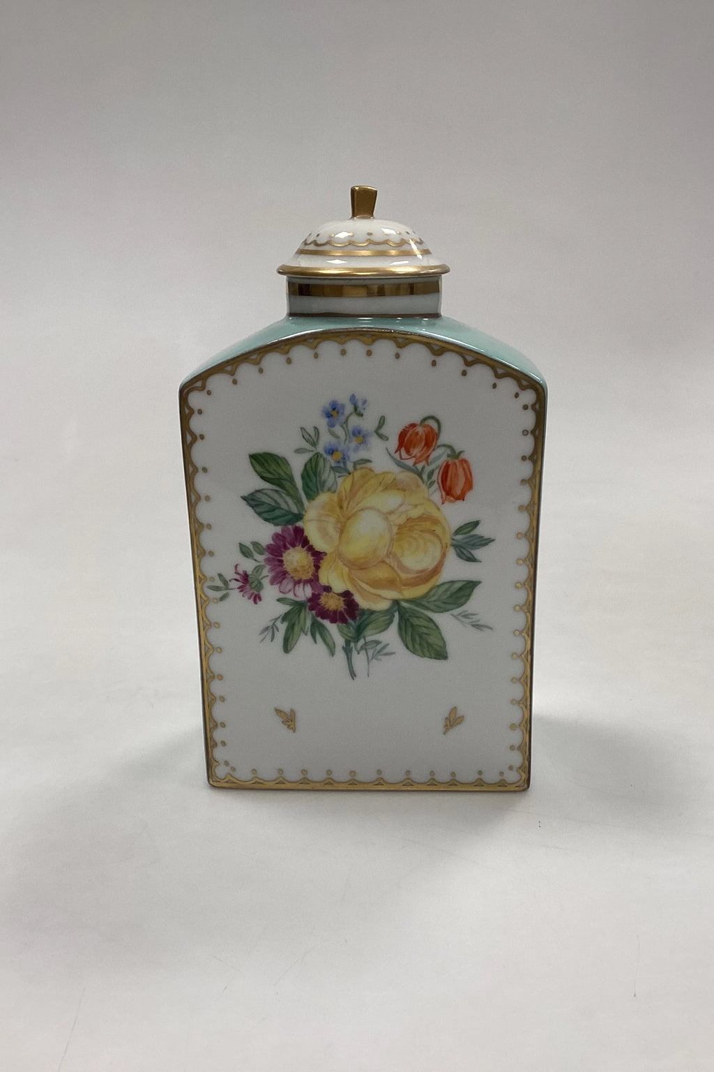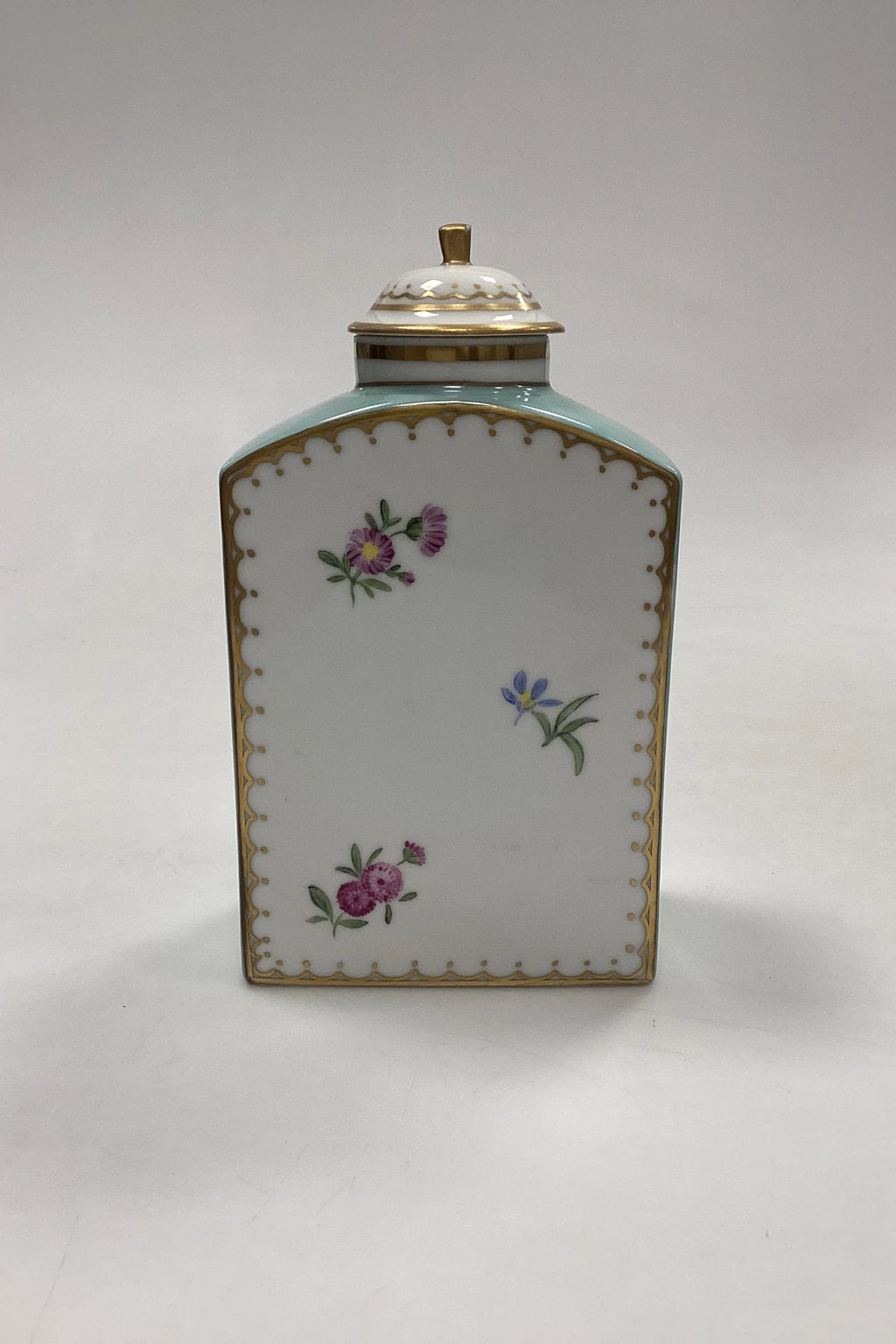 Bing og Grøndahl Tedåse No.650 med blomstermotiv på hvid baggrund, og dekoration i pistaciegrøn og guld.