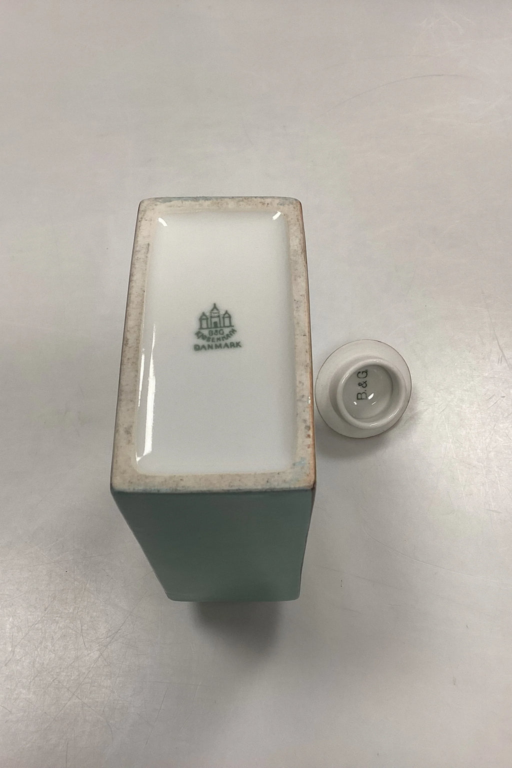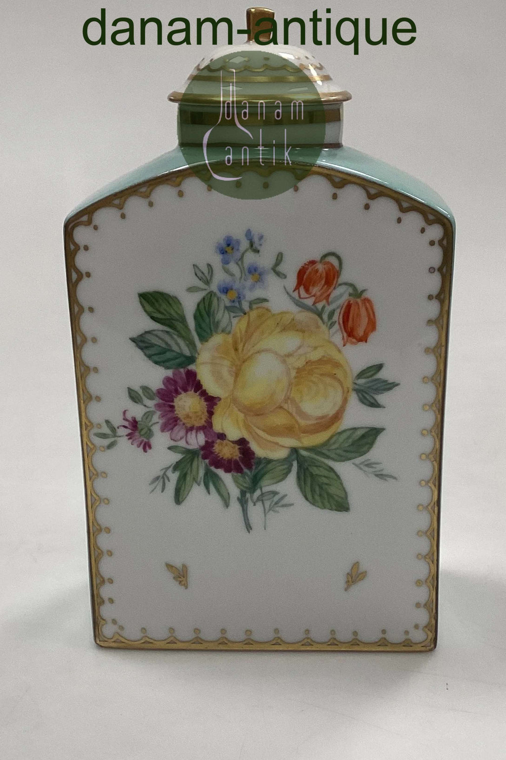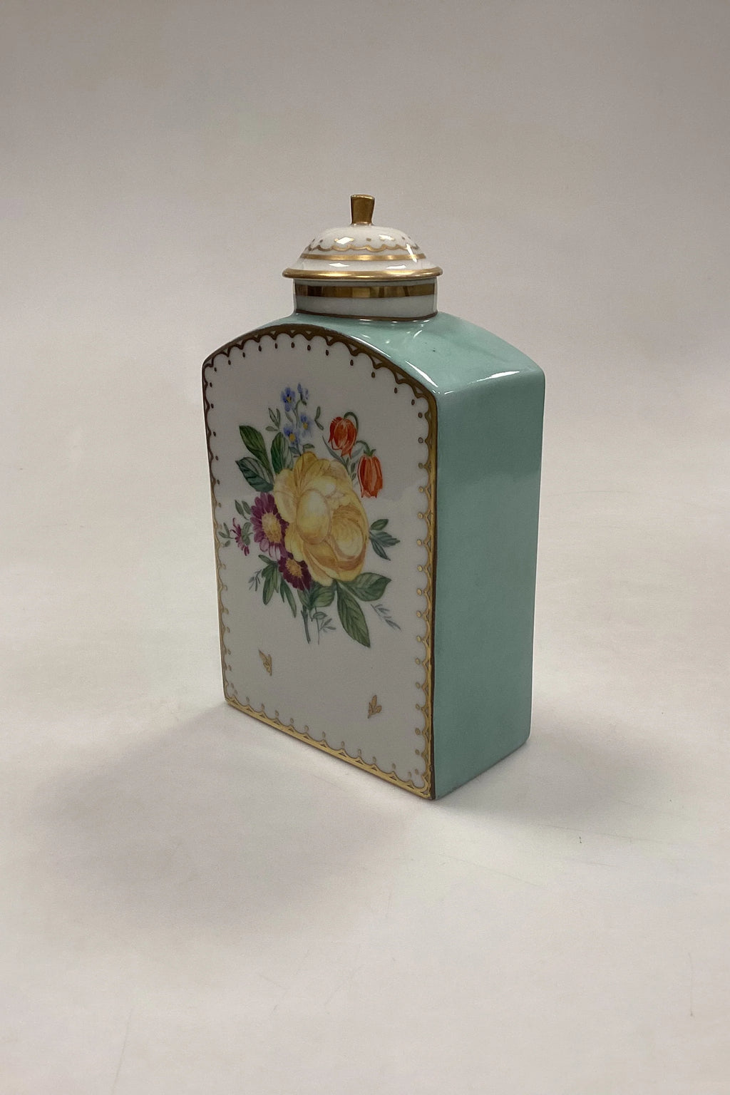 Bing og Grøndahl Tedåse No.650 med blomstermotiv på hvid baggrund, og dekoration i pistaciegrøn og guld.