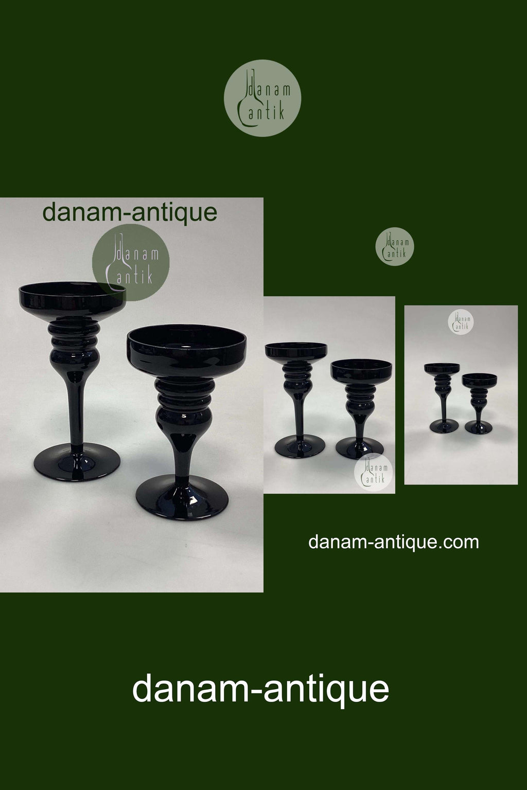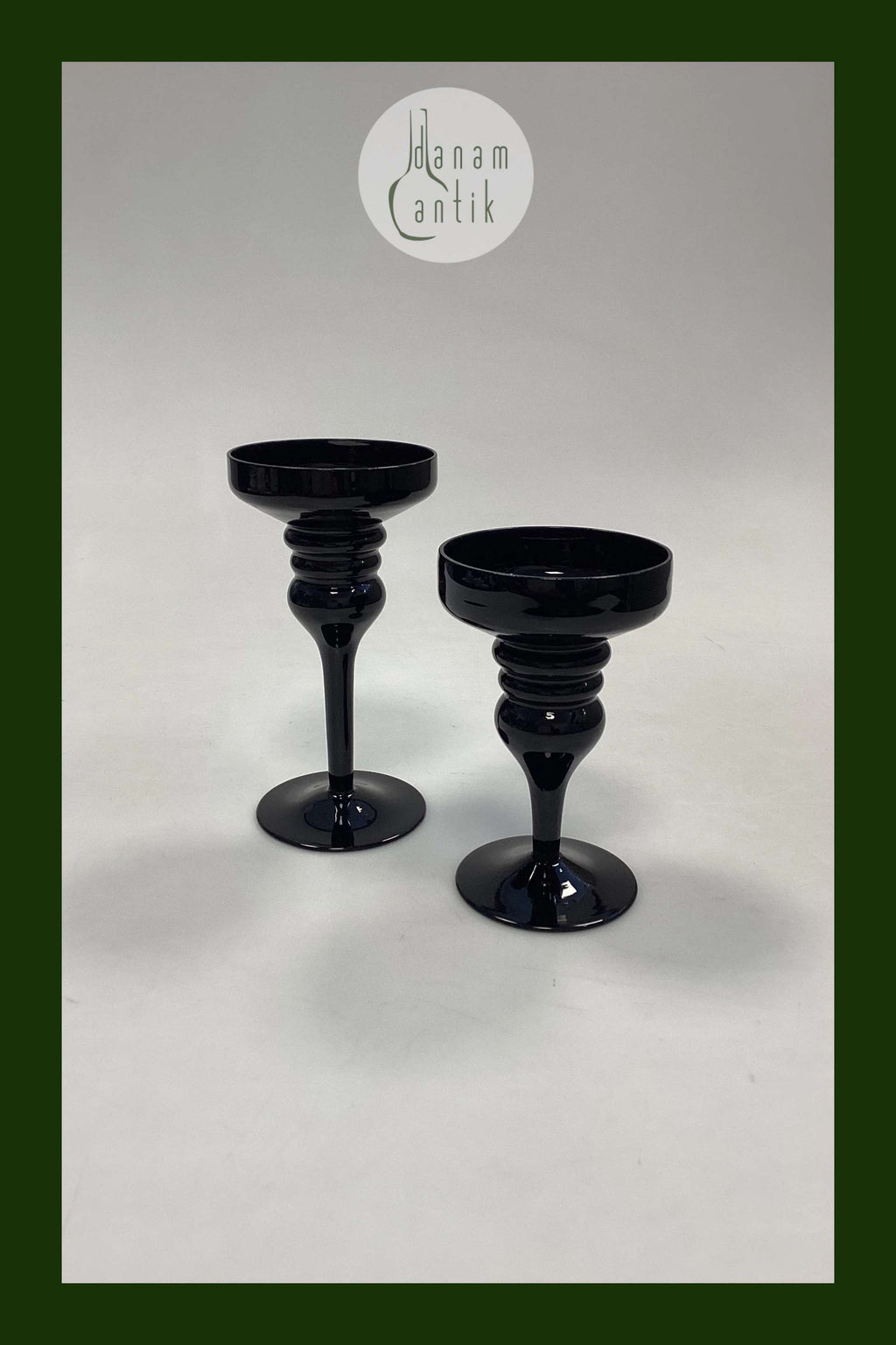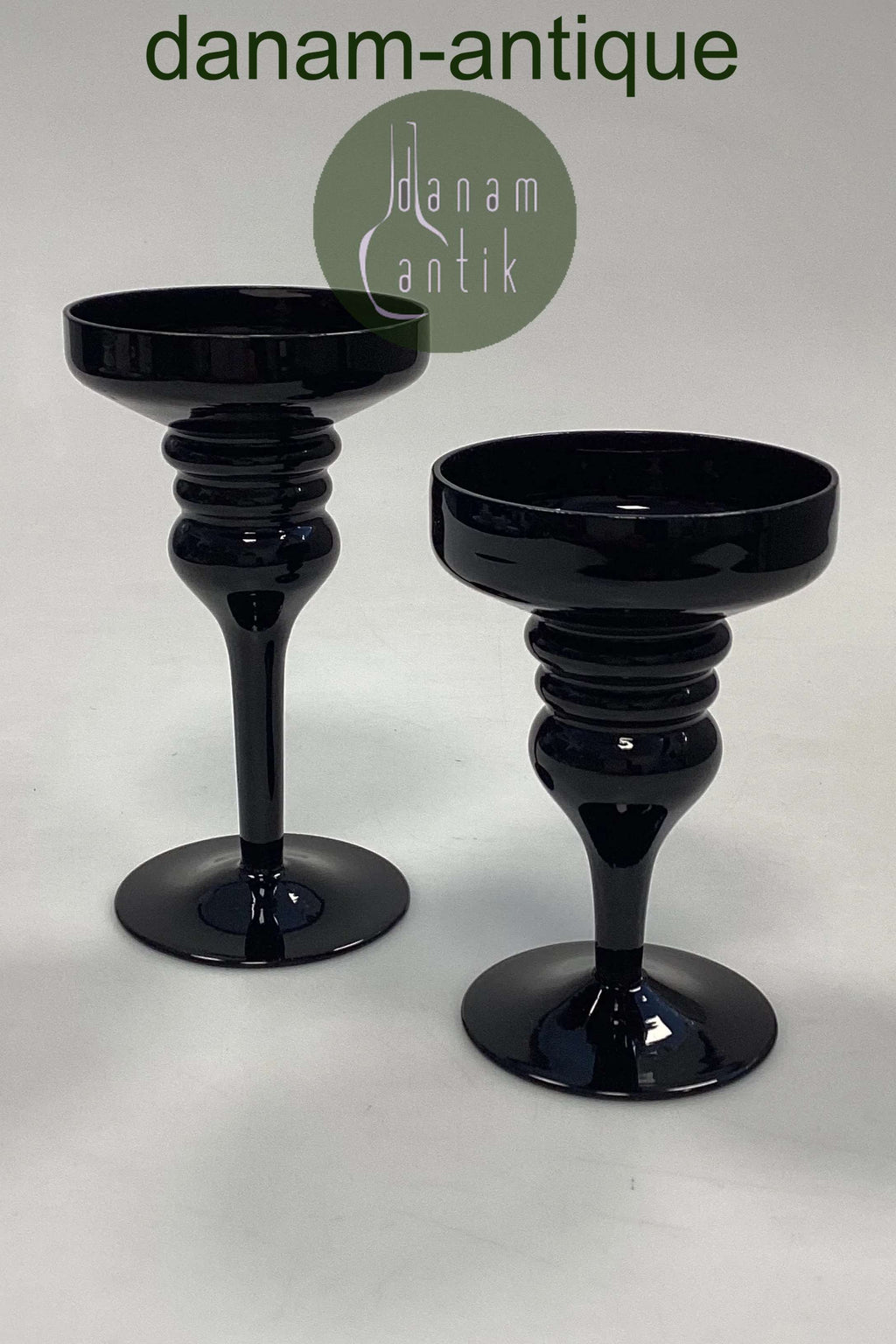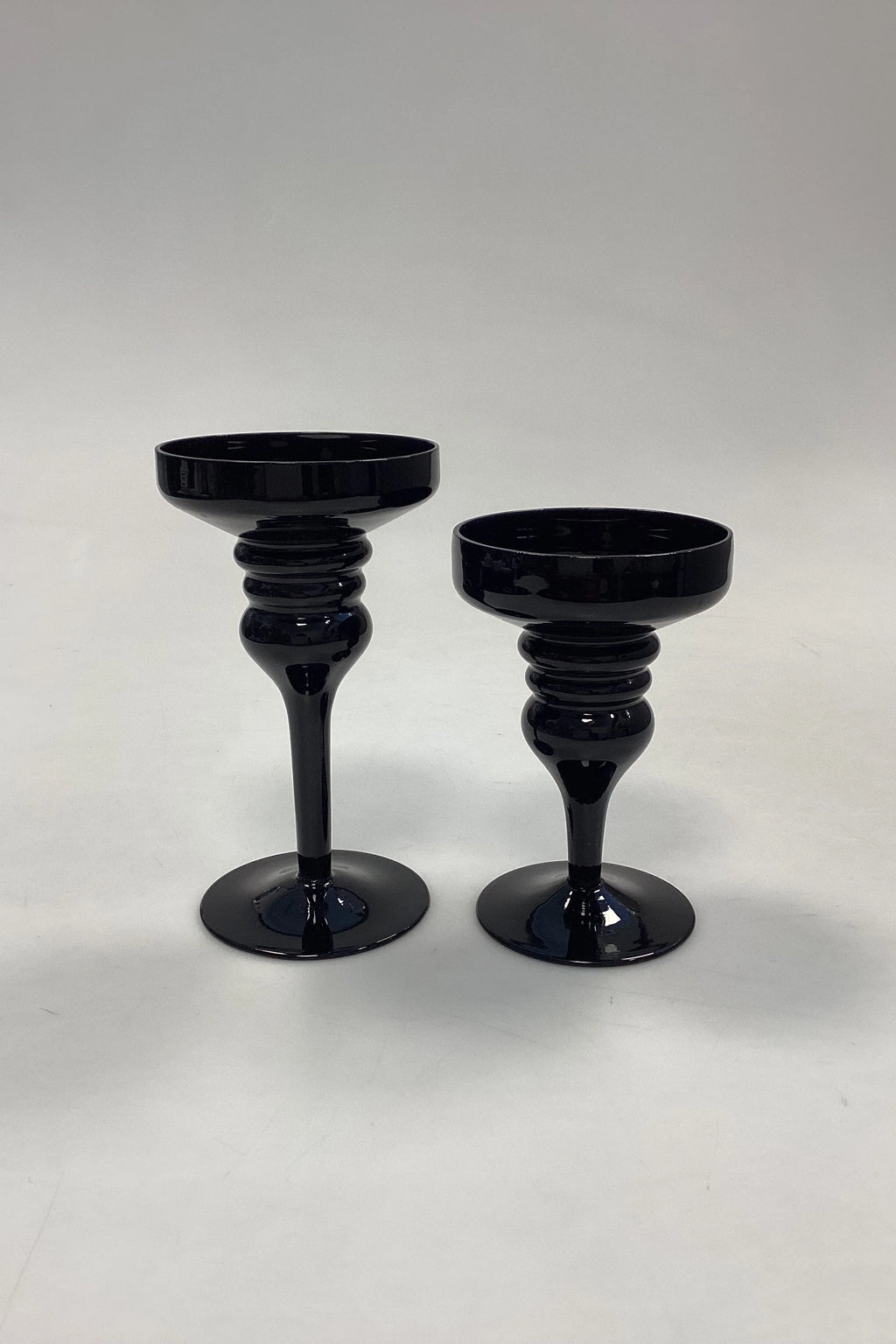 Et par Lysestager i sort glas. Stor: Måler 13,2 cm / 5,19 in. Lille: Måler 11,2 cm / 4,40 in.