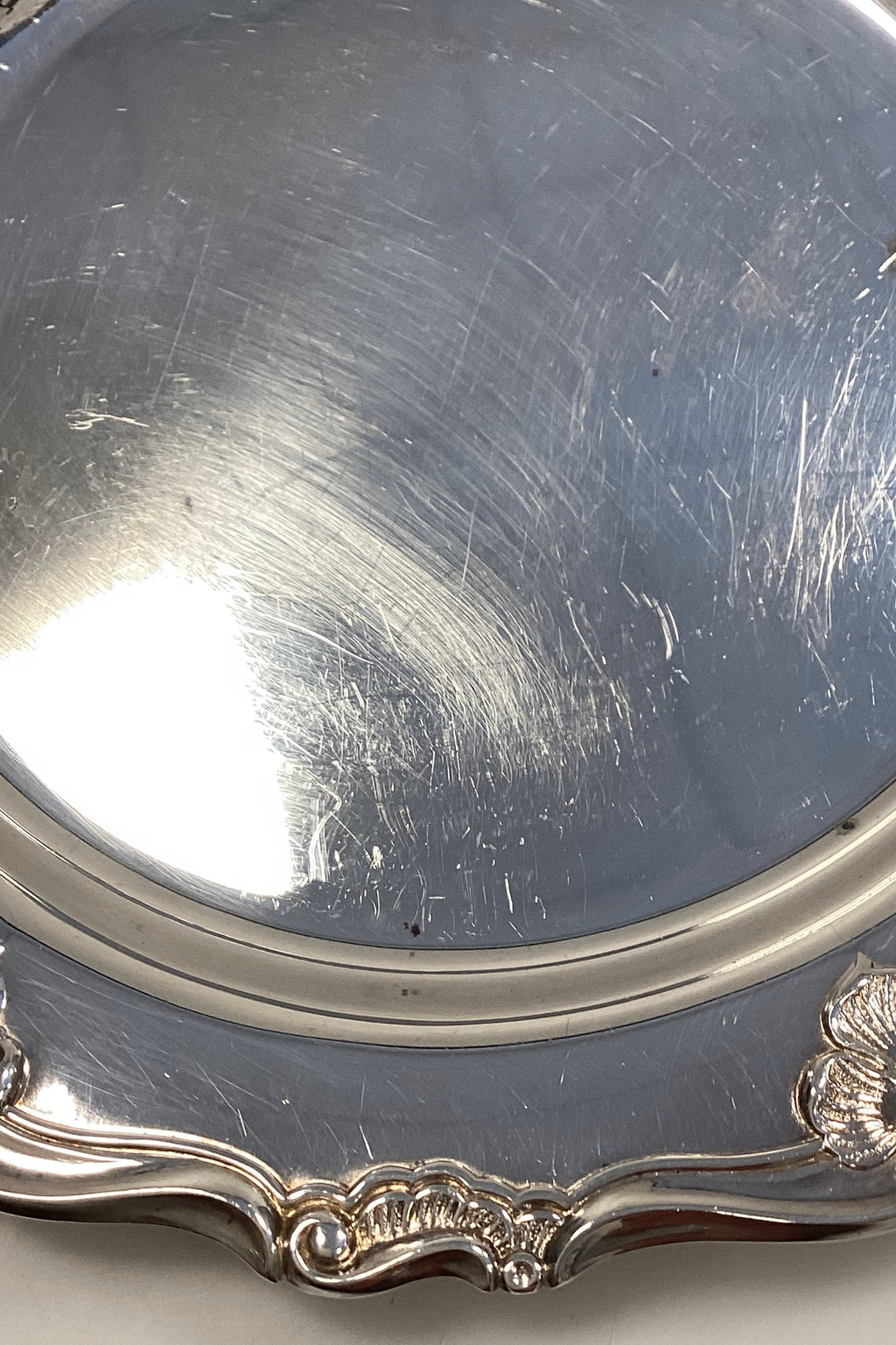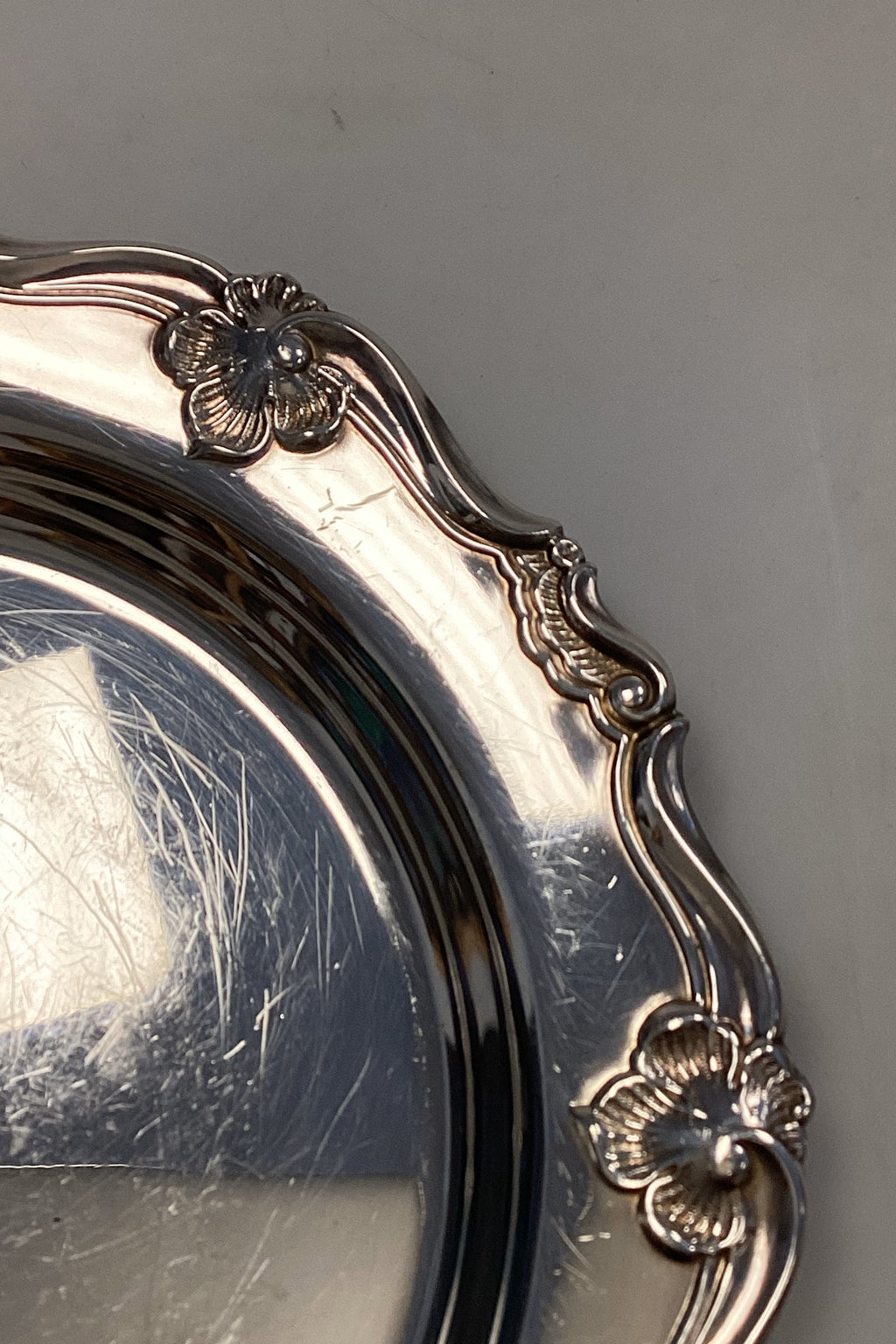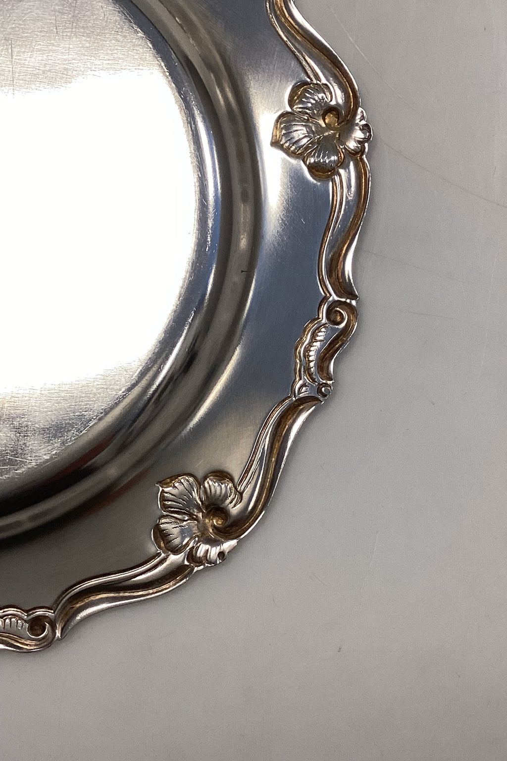 Dansk ATLA Sølvplet Flaske Bakke. Kant dekoreret med blomster. Måler 15,5 cm / 6,10 inches
