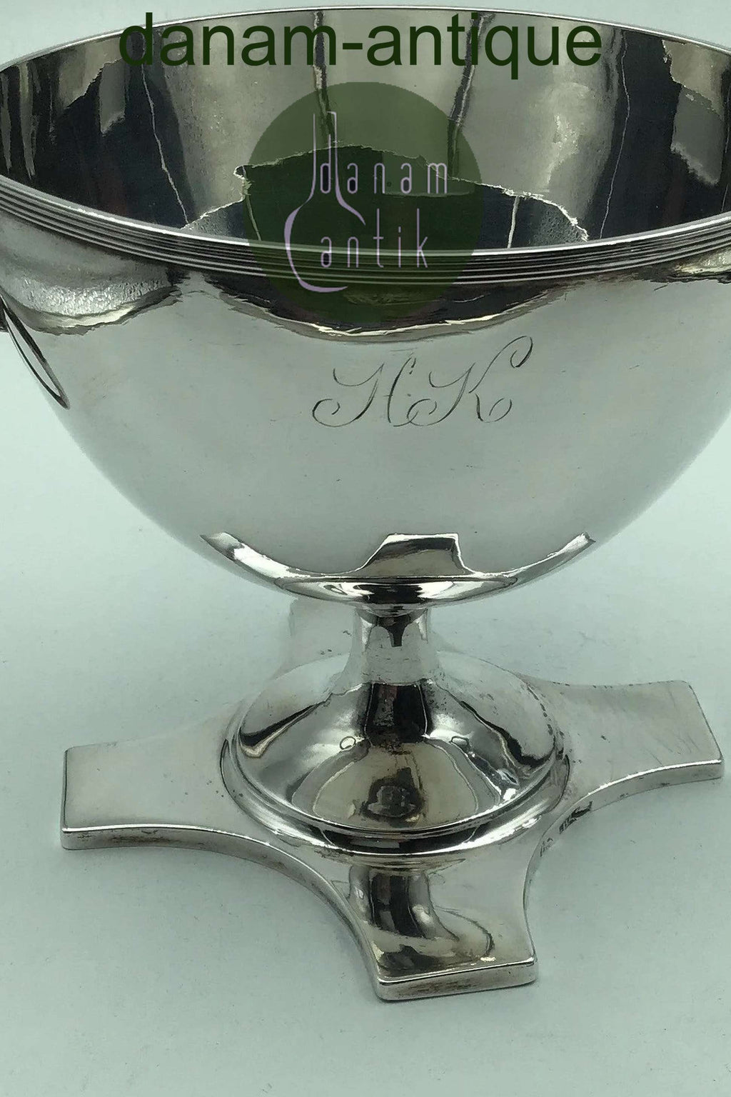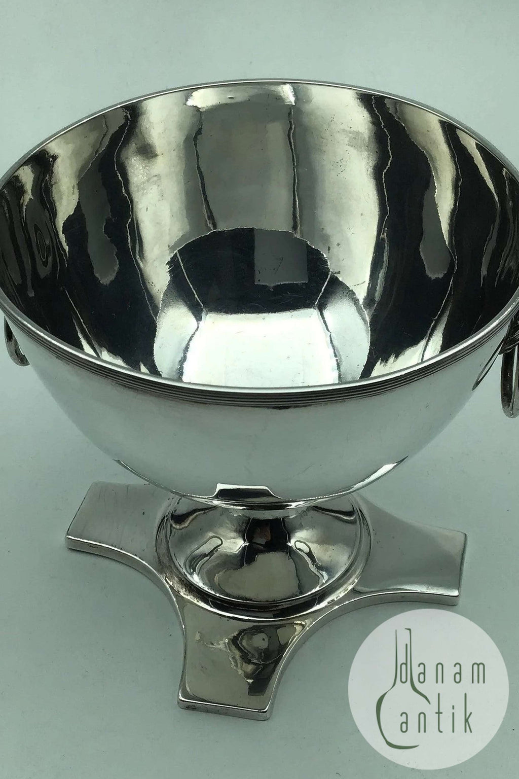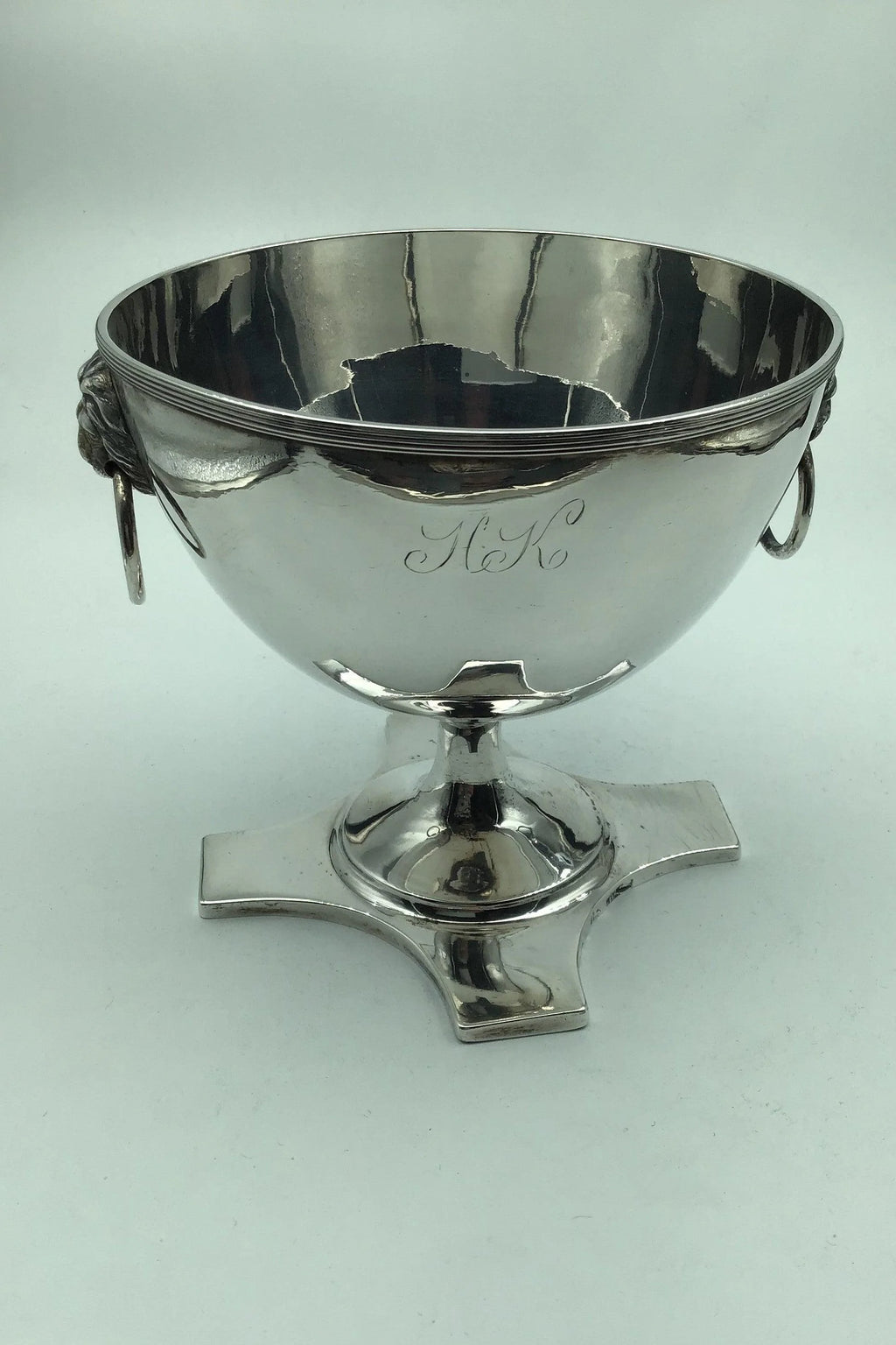 Dansk Empire Sølv Konfektskål, Rund skål på korsformet fodstykke, løvehoved-hanke i siden Måler H 12 cm Diam 13 cm Vægt 273.2 gr / 9.64 oz (Gravering)