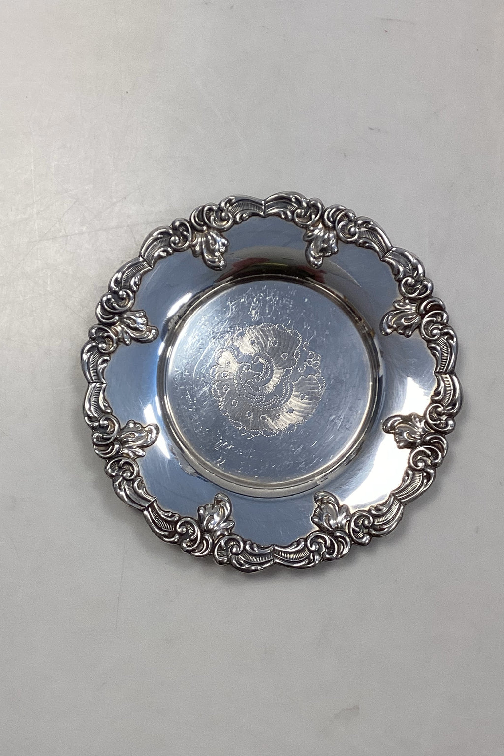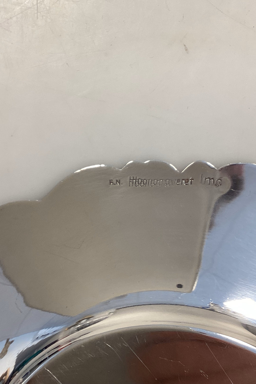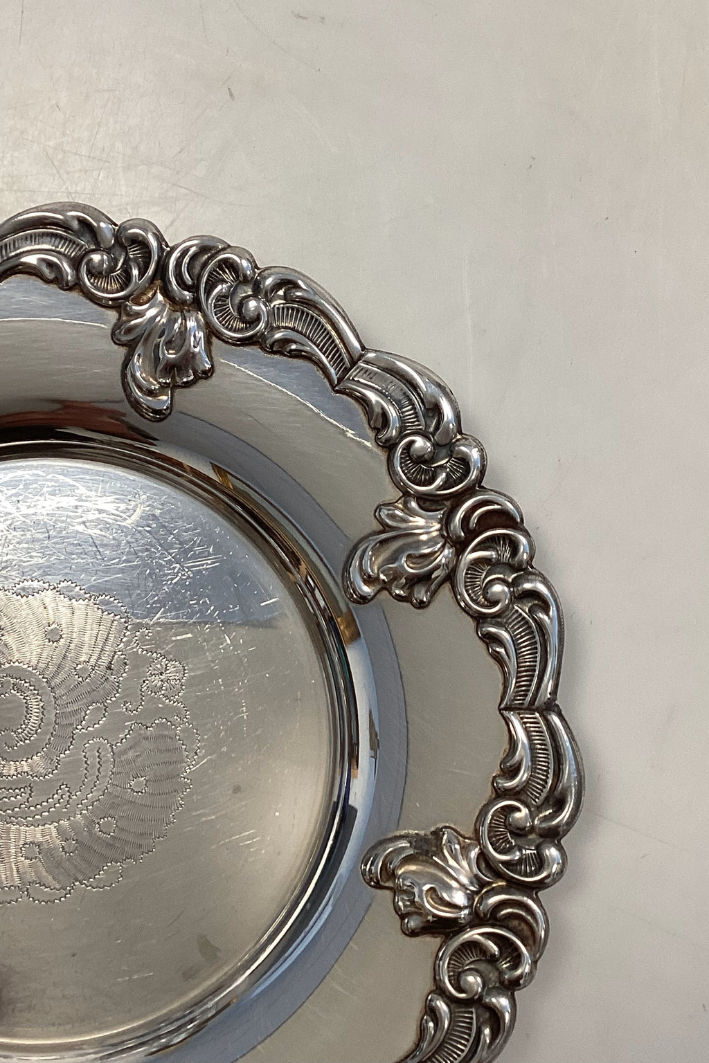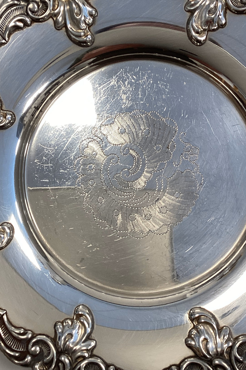 Dansk Holger Noersgaard Sølvplet Flaskebakke. Smuk udformet kant dekoration. Indgraveret udsmykning på topfladen. Måler 17,8 cm / 7 inches
