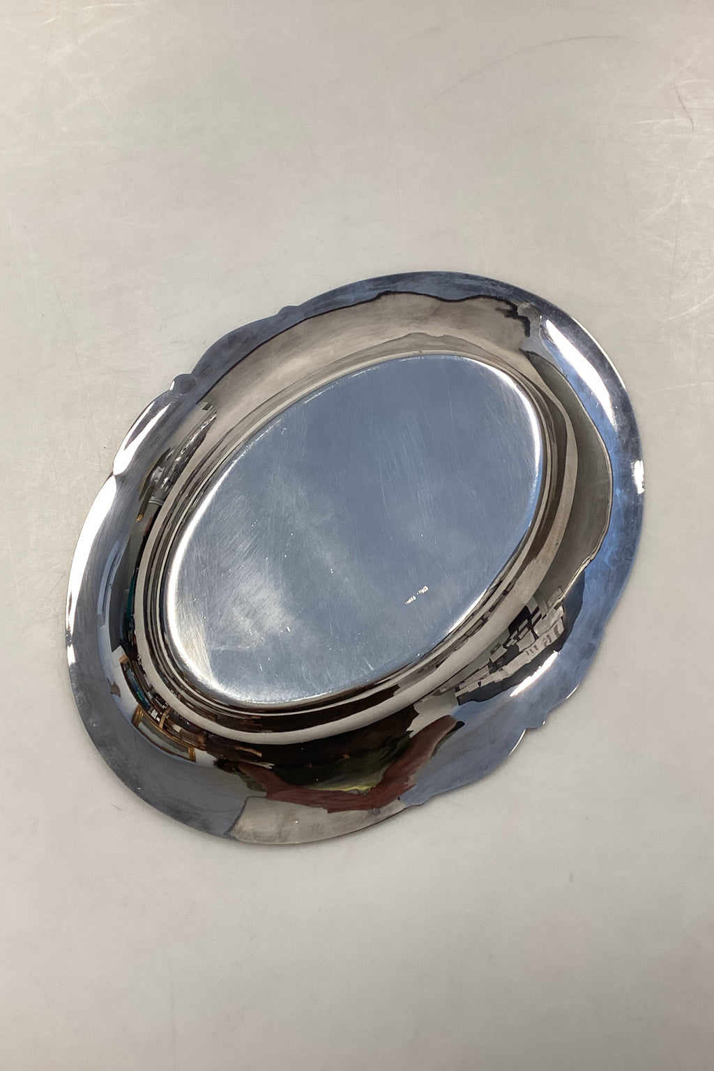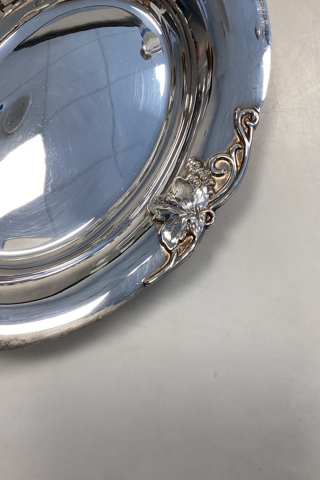 Hugo Grün Oval Sølvplet Bakke, med druemotiv på kanterne. I fin stand. Måler længde: 28 cm x 22 cm / 11,02 inches. x 8,66 inches.