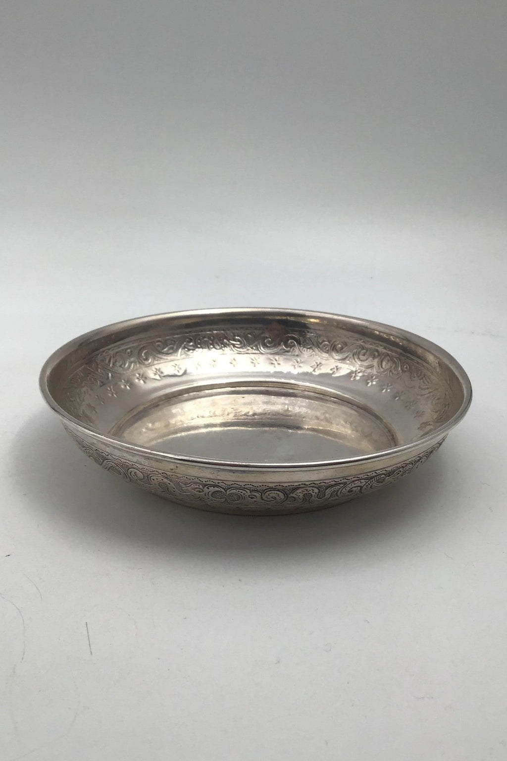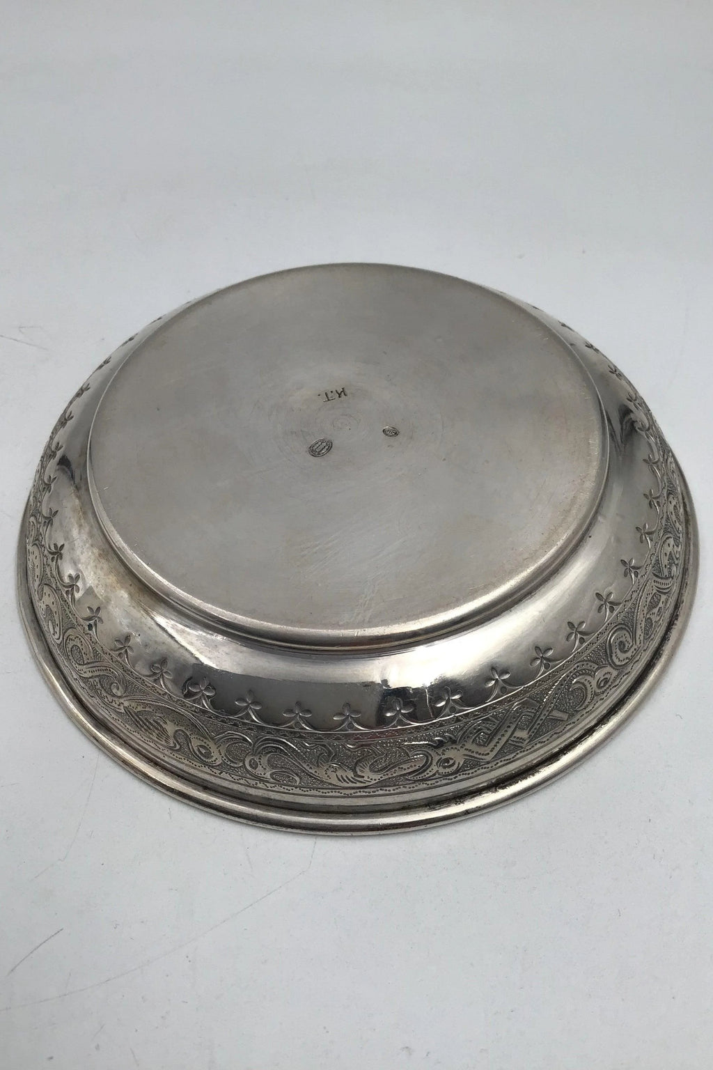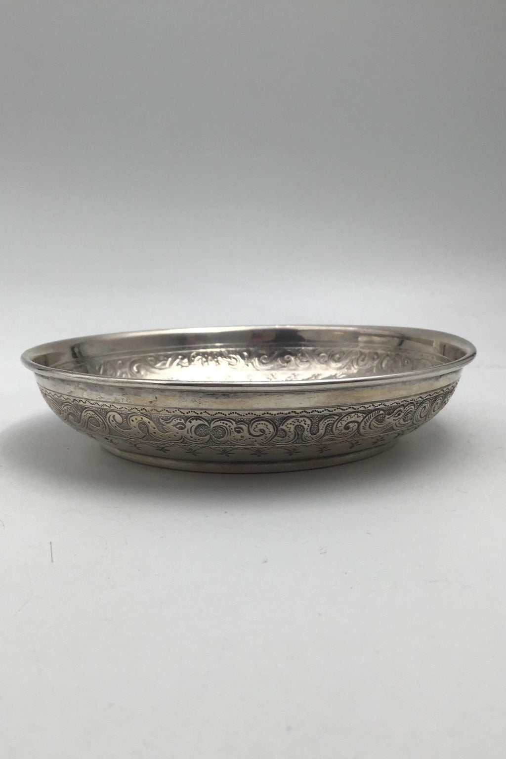 Dansk Sølv Flaskebakke med vikinge-ornamentik Måler H 2.54 cm (1 inch) Diam 12 cm(4.72 inch) Base 8 cm (3.15 inch) Vægt 86 gr (3.03 oz)