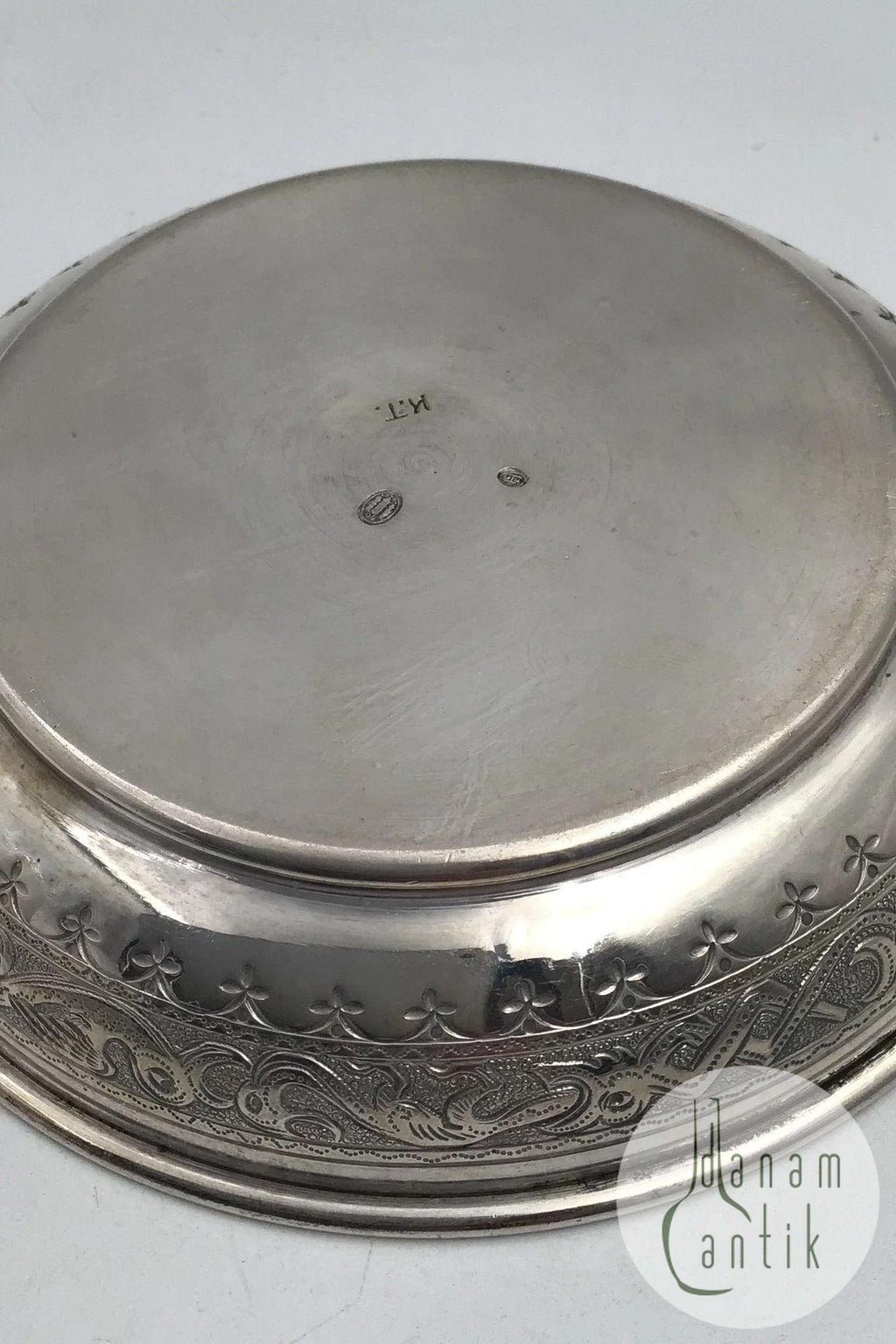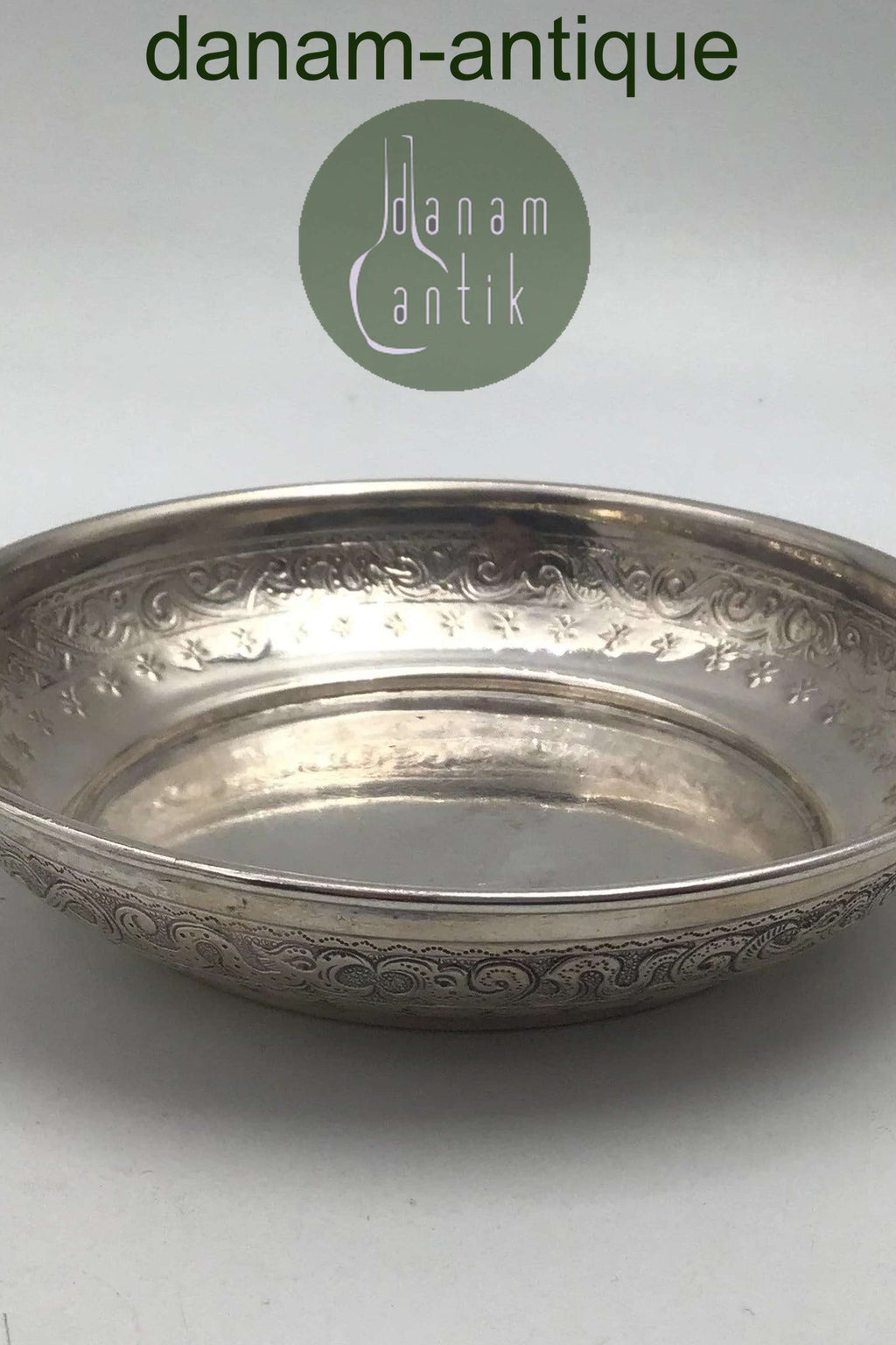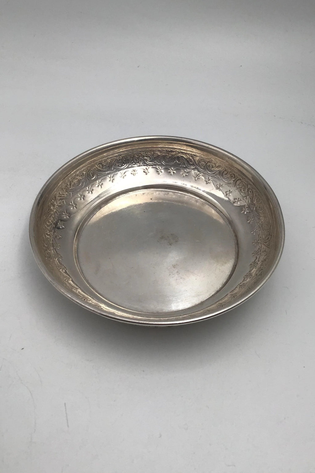 Dansk Sølv Flaskebakke med vikinge-ornamentik Måler H 2.54 cm (1 inch) Diam 12 cm(4.72 inch) Base 8 cm (3.15 inch) Vægt 86 gr (3.03 oz)