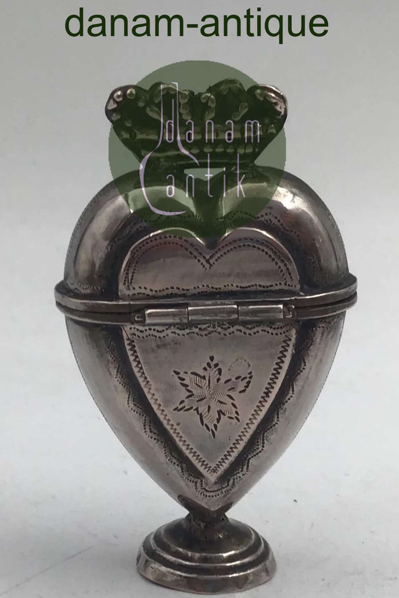 Dansk? Sølv Hovedvandsæg Hjerteformet med Krone Måler H 7.5 cm (2.95 inch) Bredde 4.5 cm (1.77 inch) Vægt 22.9 gr (0.81 oz) (Utydeligt stemplet) Brugsspor