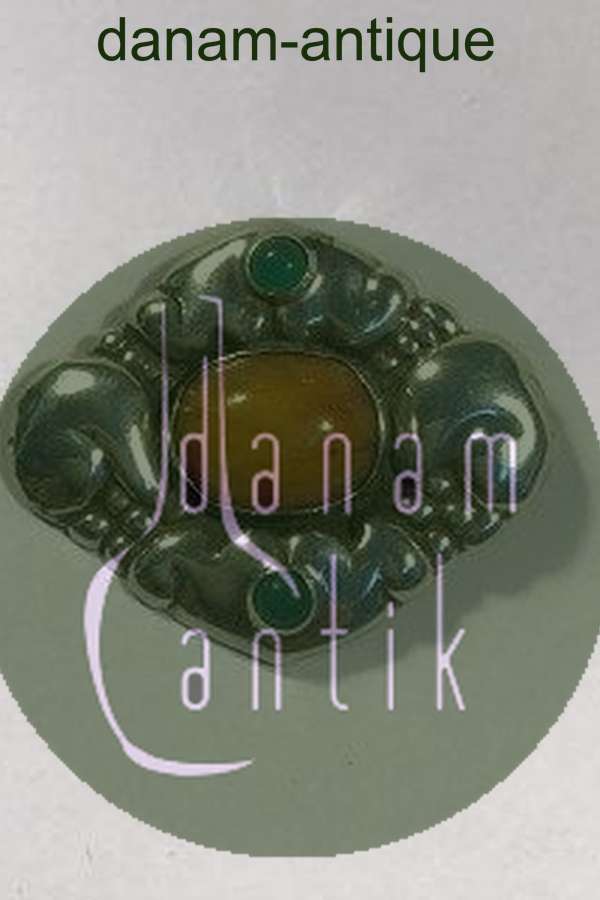 Evald Nielsen Sølv Broche, Ravcenter flankeret af grønne sten Hægtet delvist fornyet Måler 5,6 cm x 4.6 cm/2.20" x 1.81" Vægt 13.1 gr/0.46 oz