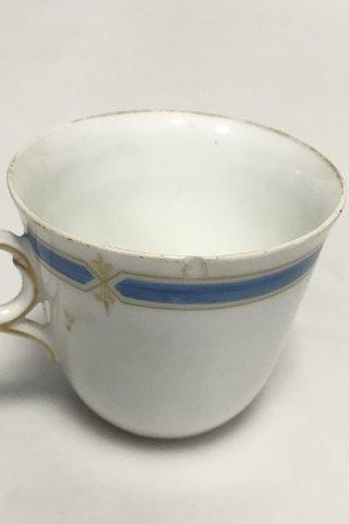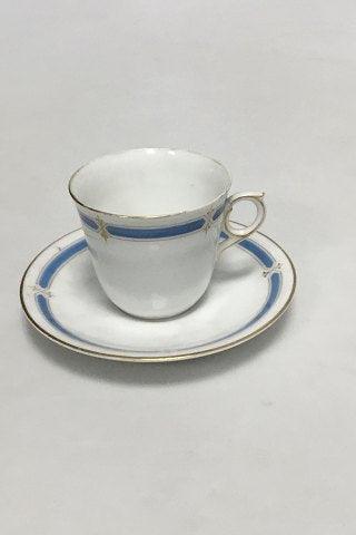 Frederiksborglotteriet kop og underkop i porcelæn med blå dekoration og guld. Begge dele stemplet med engel, underkop tillige med Royal Copenhagen 3 bølger. Diverse småskader og reparation på hanken. Se billeder. H: 6cm.