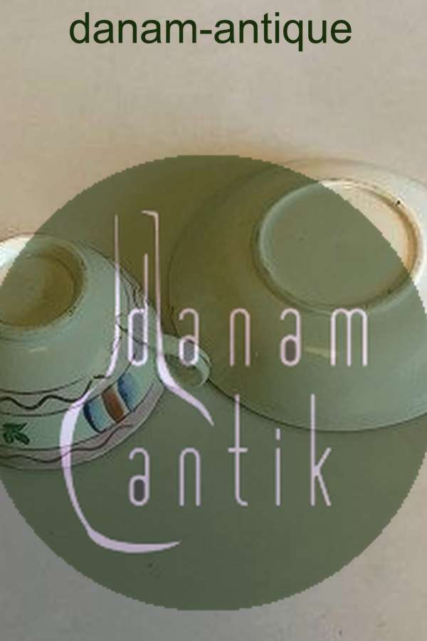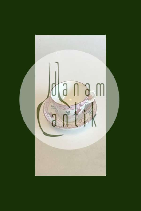 Gammel Thekop med rød dekoration. Ikke dansk, antagelig tysk eller fransk. Måler kop: 5,8 cm x 10 cm dia. Underkop: 14,5 cm dia.