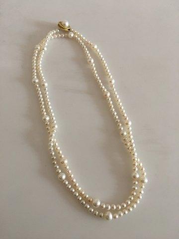 Georg Jensen Collier med Hvide Ferskvandskulturperler og Guldlukning. 88 cm L. Kuglerunde perler i flot stand. Flere styling muligheder. Perlerne er 4mm og de store 7mm