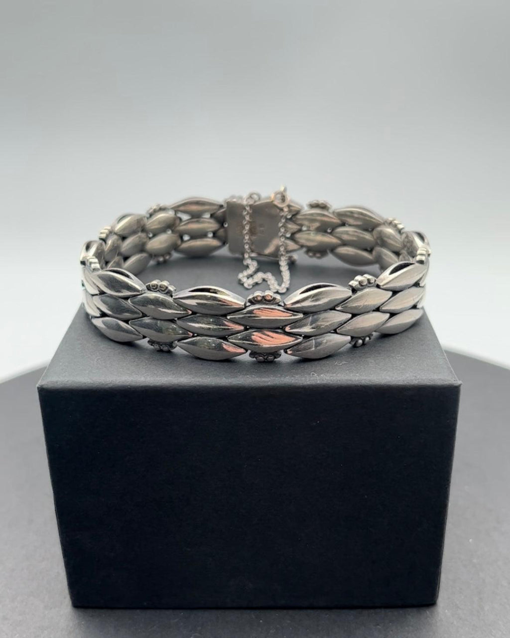 Georg Jensen Sterling Sølv Armbånd No 86. Med sikkerhedskæde. Designet af Harald Nielsen. Måler 19 cm x 1,3 cm bredt. Vejer 40 g. Fra efter 1945.