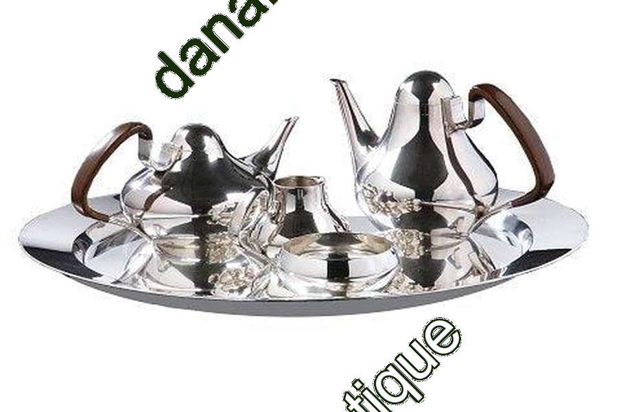 Georg Jensen Sterling Sølv Henning Koppel Te og Kaffesæt med Tekande, Kaffekande, Bakke, Flødekande og Sukkerskål No 1017. Sættet er med tidligere stempler. Tekande med Håndtag af Guayacan Træ 12 cm H. 88 cl. Vejer 692 gram. Kaffekande med Håndtag af Guayacan Træ 15 cm H. Vejer 670 gram. Flødekande 7.5 cm H. Vejer 260 gram. Sukkerskål 10.5 cm Ø. Vejer 176 gram. Bakke 52 x 45.5 cm, Vejer 2,8 Kg. Sættet er i perfekt stand.