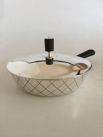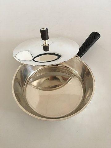 Georg Jensen Kasserolle i Sterling Sølv med Træhåndtag i Art Deco Stil. Kasserollen måler 4 cm op til kanten og har en diameter på 16 cm. Håndtaget er 11.3 cm L. Vejer 558 gram. Kasserollen er med Georg Jensen Stempler fra efter 1945 og er i smuk stand.