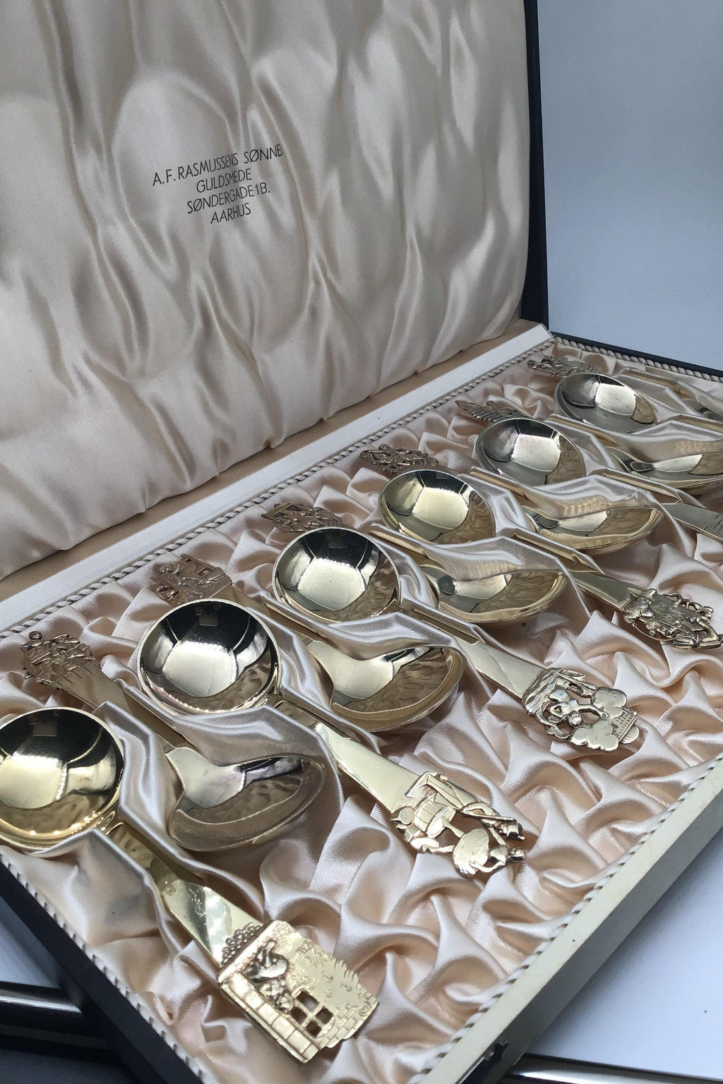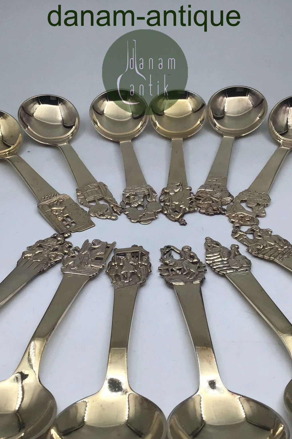 H.C. Andersen Eventyr Sølv Forgyldt Barneskeer/Suppeskeer Sæt (12) Måler 14 cm (5.51 inch) Præsentationsæske.