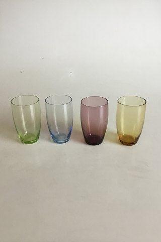 Holmegaard/Kastrup 4 Sodavandglas i blåt, grønt, gul og lilla.