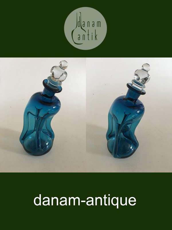 Holmegaard / Kastrup Glasværk Kluk Kluk Karaffel i Blå med Klar Kroneformet Prop. Indsugede sider der krummer i den en side. 26 cm Høj. I fin stand.