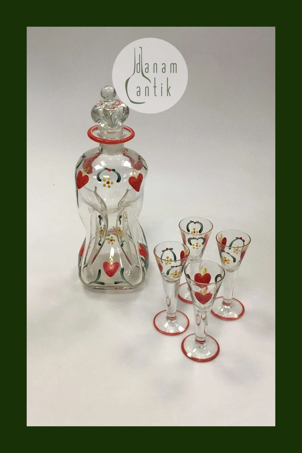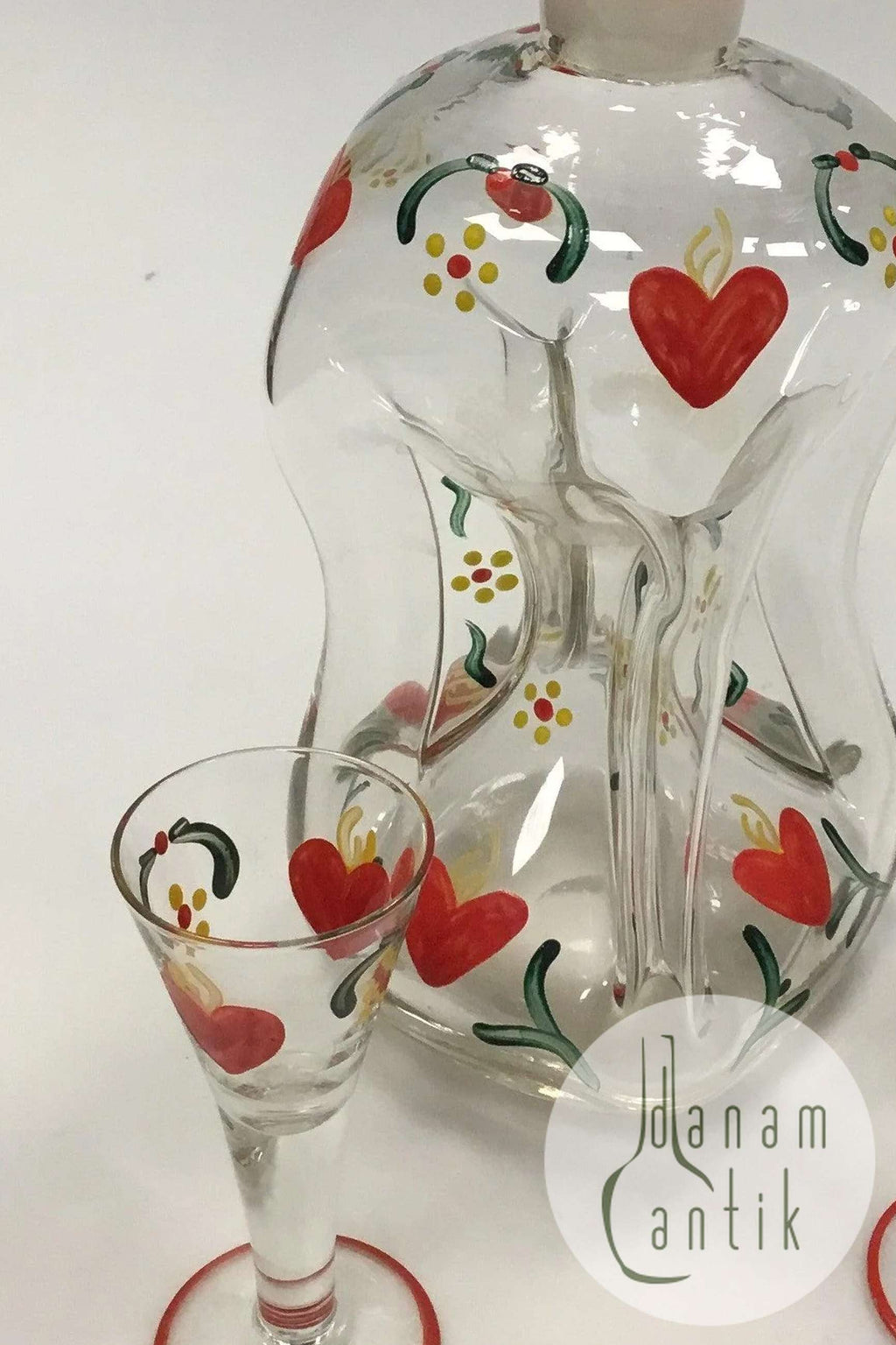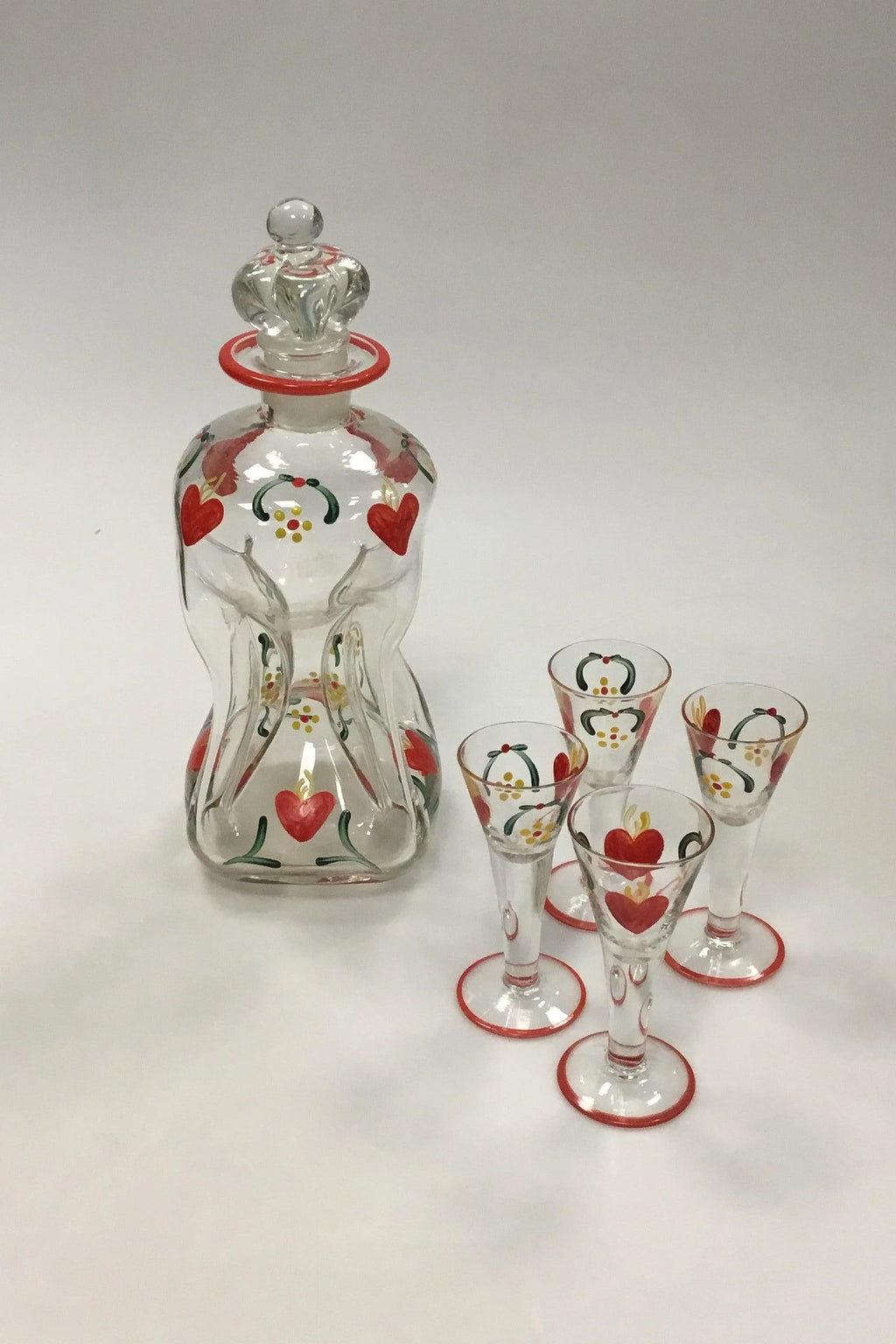 Holmegaard Klukflaske med 4 tilhørende snapseglas dekoreret med røde hjerter mm. Måler Klukflaske: 25 cm ( 9 27/32 in. ) Glas: 10,5 cm ( 4 9/64 in. )