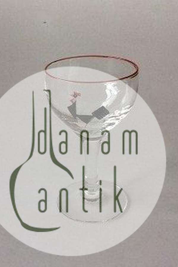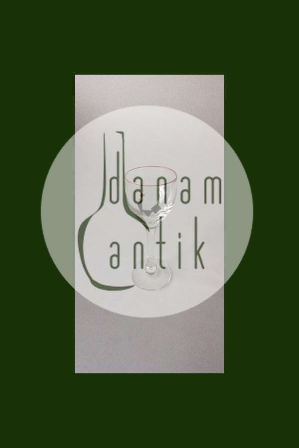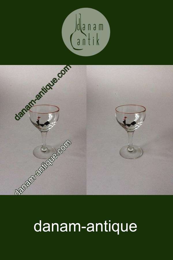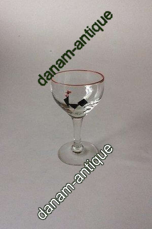 Holmegaard Likørglas dekoreret med sort hane og rød rand.