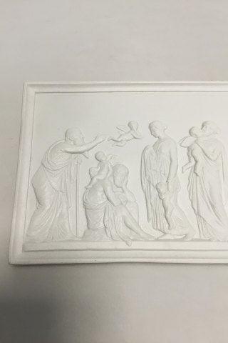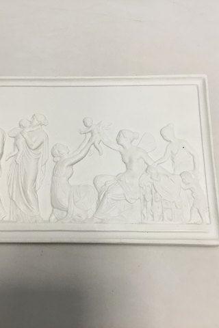 Kgl. Porcelæn Biscuit Platte Kærlighedens Aldre nr. 115. Måler 30,5cm x 12cm. Mindre punktformet brændingsfejl, se billede. Royal Copenhagen. Kopi af Christian Christensen i 1841, efter Thorvaldsens original fra Rom 1824.