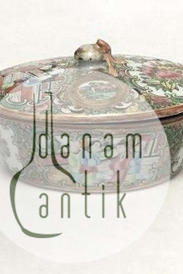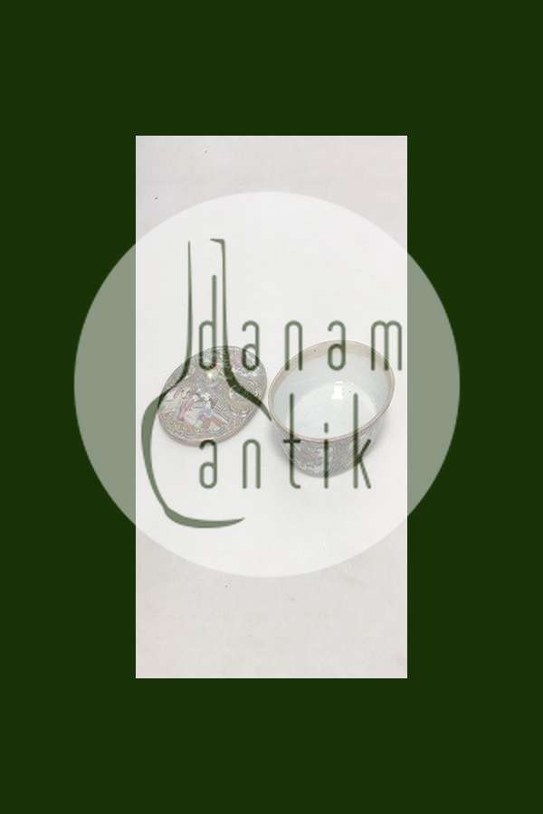 Kinesisk canton porcelæn (gold & green) terrin. Med paladsscener samt fugle og sommerfugle. Ca. 1850. L: 13 cm, H: 6,5 cm